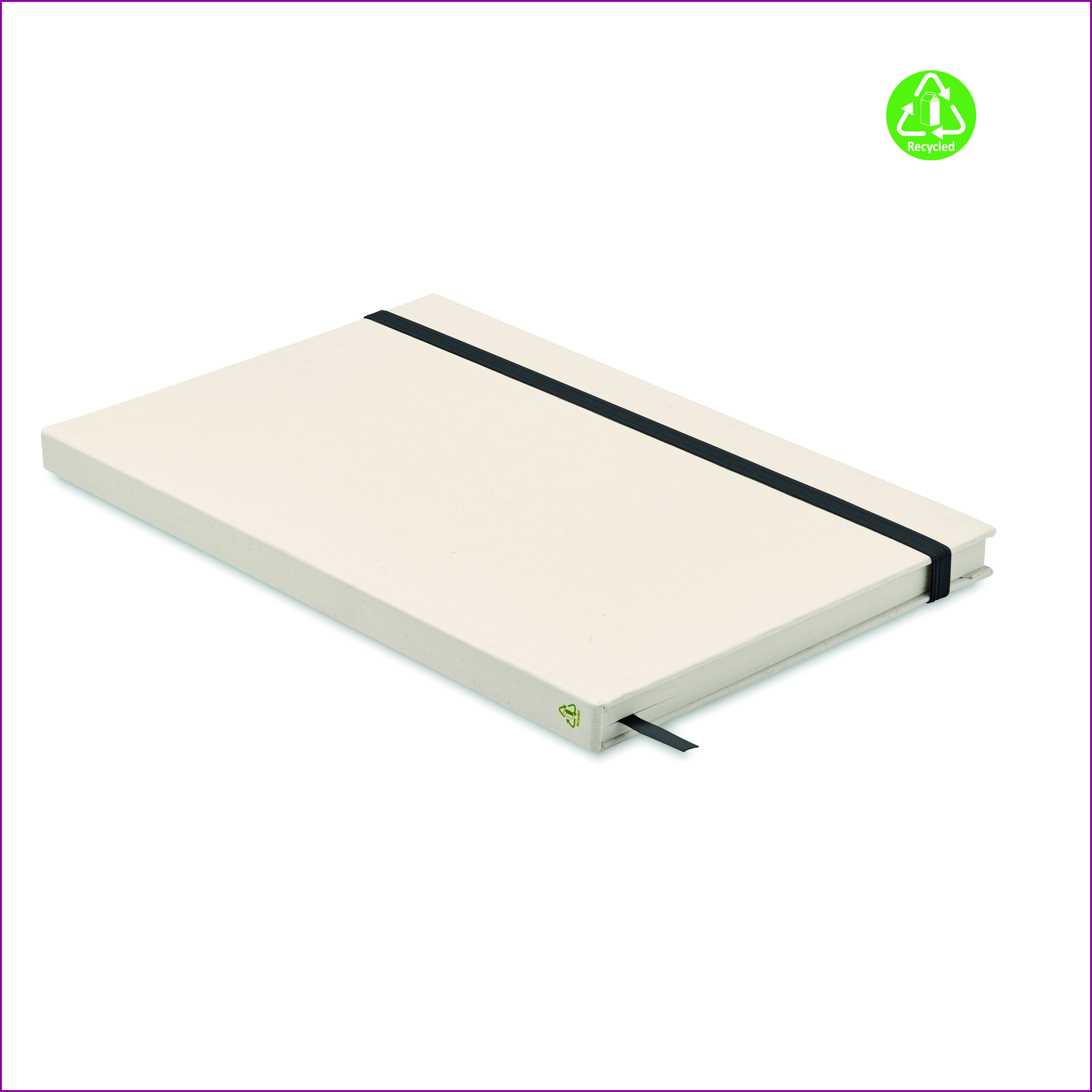 Kierrätysmateriaalista valmistettu A5 muistikirja kovalla kannella. Materiaali on 70% maitopurkeista tehtyä kierrätyskartonkia ja 30 % kierrätyspaperia. Sisällä 160 viivoitettua sivua (80 arkkia 80 g/m²) kierrätyspaperia. Suljetaan kuminauhalla ja muistikirjassa on kirjanmerkki.