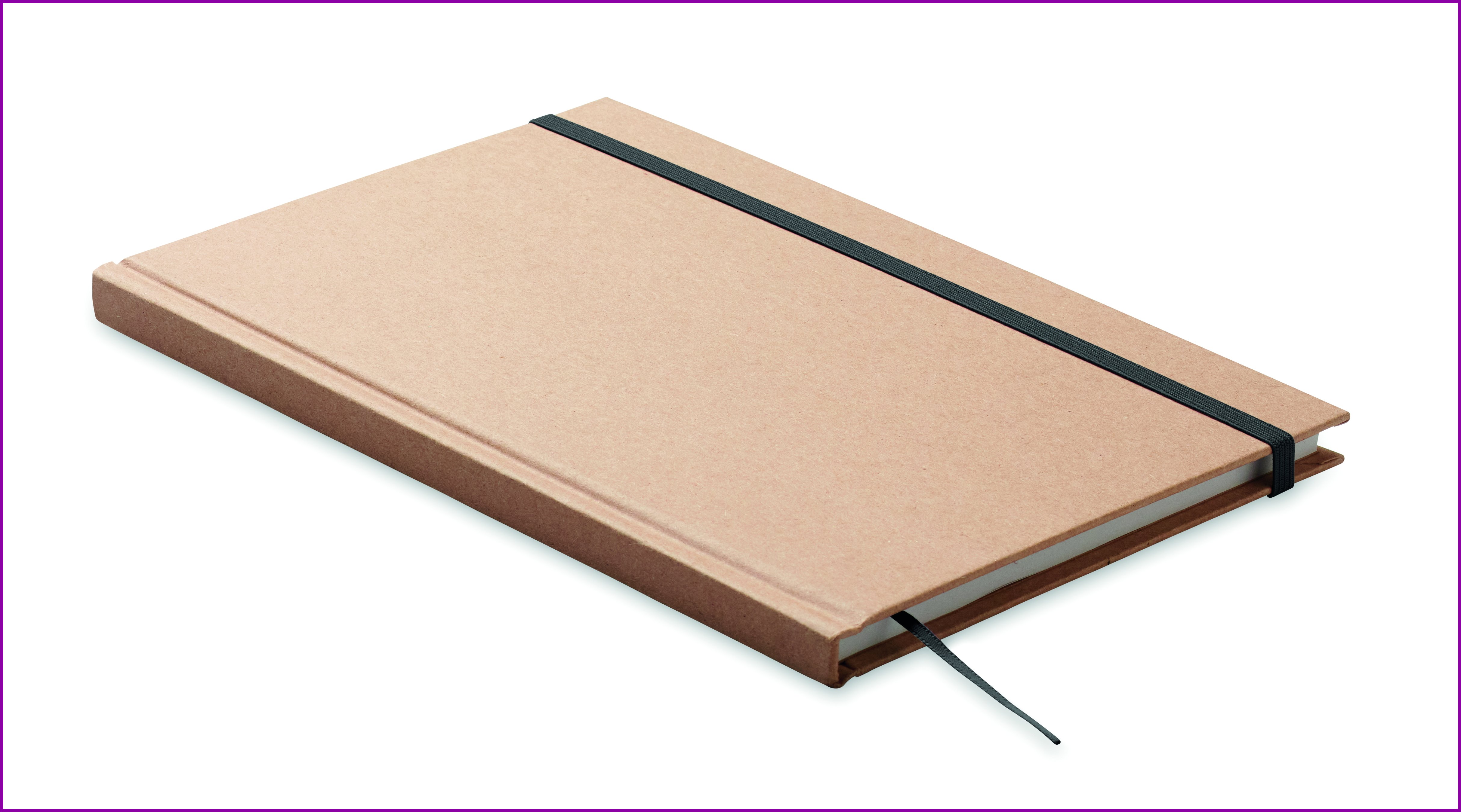A5 muistikirja jossa kovat, kierrätyskartongista valmistetut kannet. 200 viivoitettua sivua kierrätyspaperista (100 arkkia/80 g/m²). Kuminauha kiinnitys ja kirjanmerkki. Valmistettu EU:ssa.