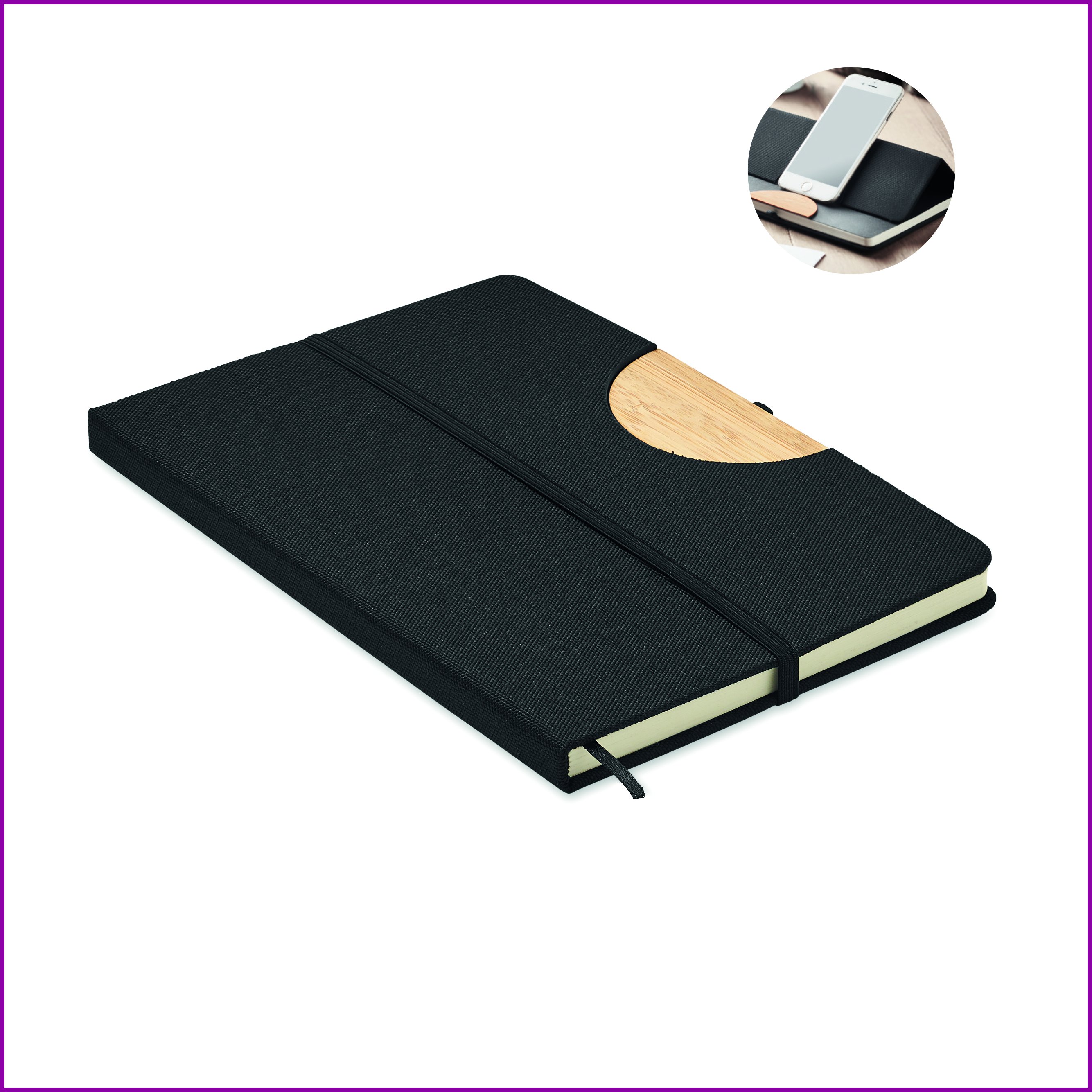 A5 muistikirja kovalla RPET kannella, bambu yksityiskohta toimii puhelintelineenä. 160 viivoitettua kierrätettyä sivua (80 arkkia) ja väriltään yhteensopiva elastinen suljin. Täydellinen muistikirja pitämään muistiinpanosi tallessa, sisäänrakennettu puhelimenteline auttaa pitämään laitteesi pystyssä kokousten aikana ja kätesi vapaana tekemään muistiinpanoja. FSC®-certified | FSC MIX CREDIT, P7.1, FSC-C213206
