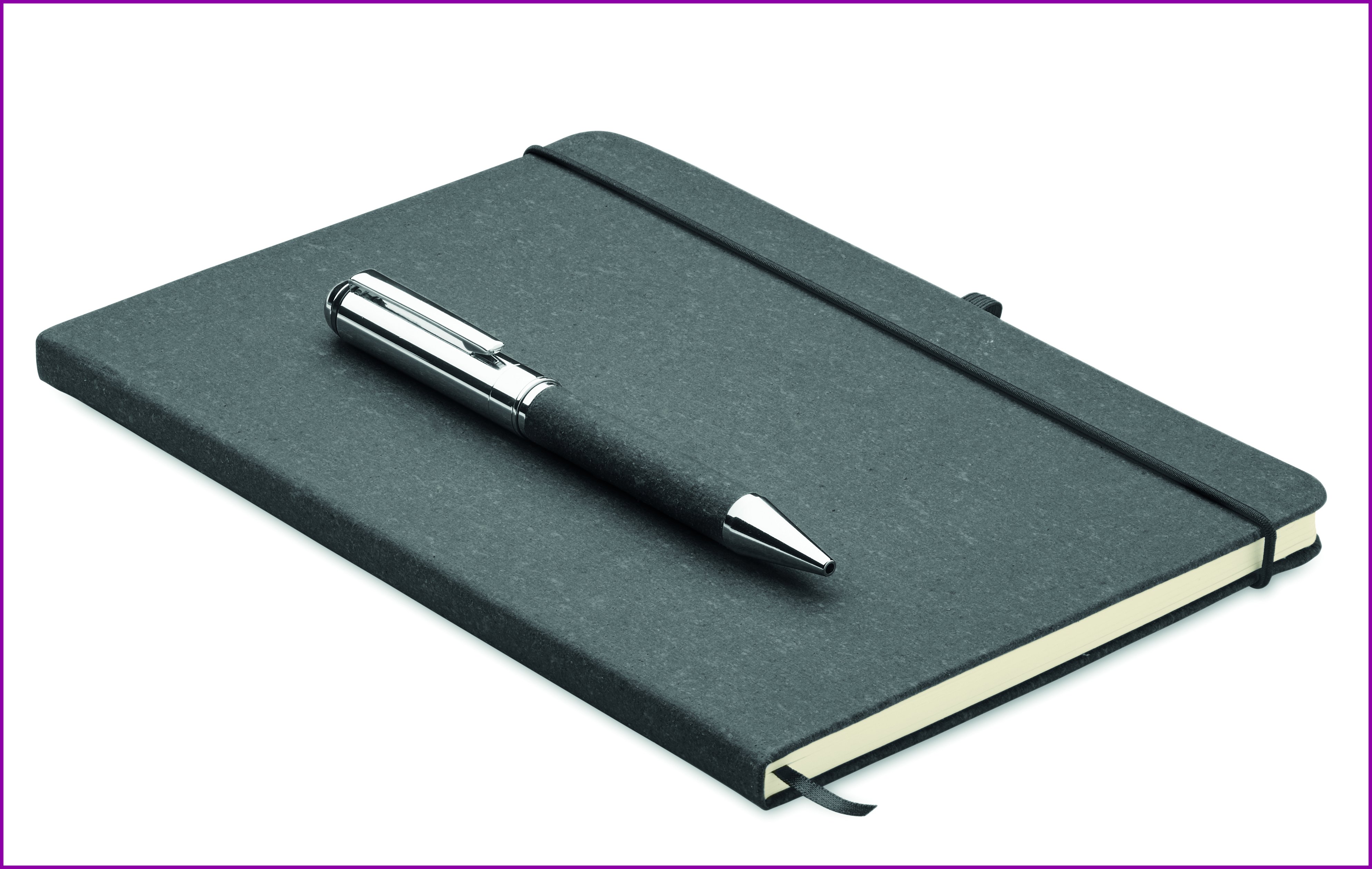 Lahjasetti. Kierrätysnahasta (75 %) valmistettu kovakantinen A5-muistikirja. 160 viivoitettua sivua kierrätyspaperia (80 arkkia). Muistikirjassa sulkunauha, kirjanmerkki ja joustava kynäpidike. Setissä samanvärinen metallinen kierrekynä. Sininen muste. Toimitetaan ruskeassa voimapaperirasiassa. FSC®-certified | FSC MIX CREDIT, P7.1, FSC-C213206