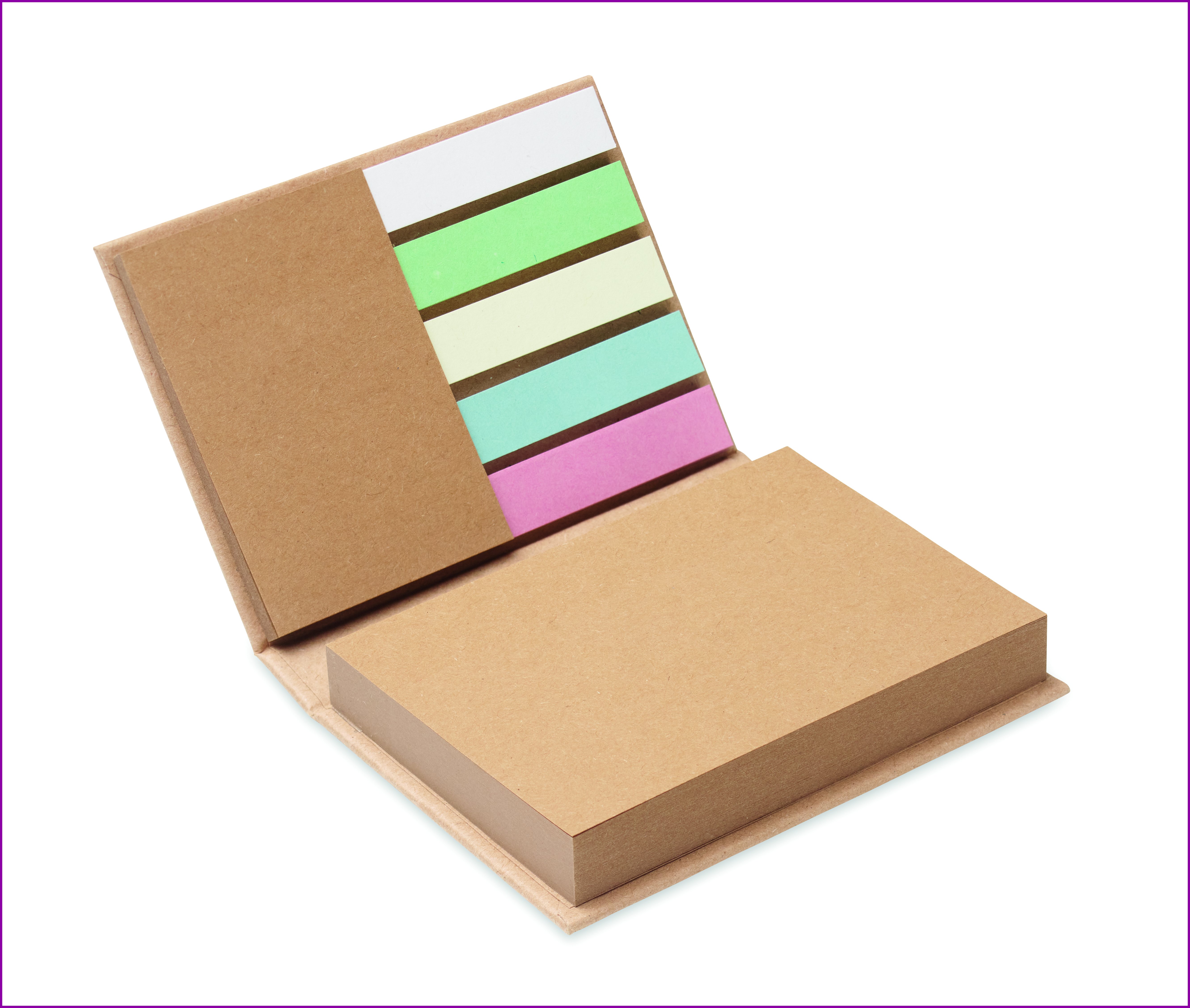 3-osainen kierrätyspaperista valmistettu muistilappuvihko. Suuret ja keskikokoiset muistilaput ja 5 eriväristä sivumerkkiä. Valmistettu EU:ssa.