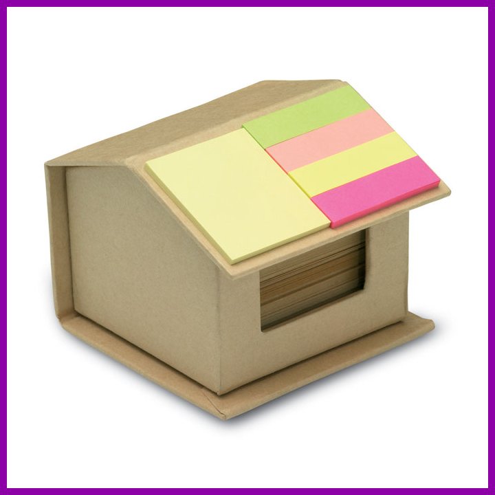 Talon muotoinen kierrätysmateriaalista valmistettu muistilapputeline, sisältää 300 sivua kierrätyspaperia ja värikkäitä indeksi muistilappuja katolla.