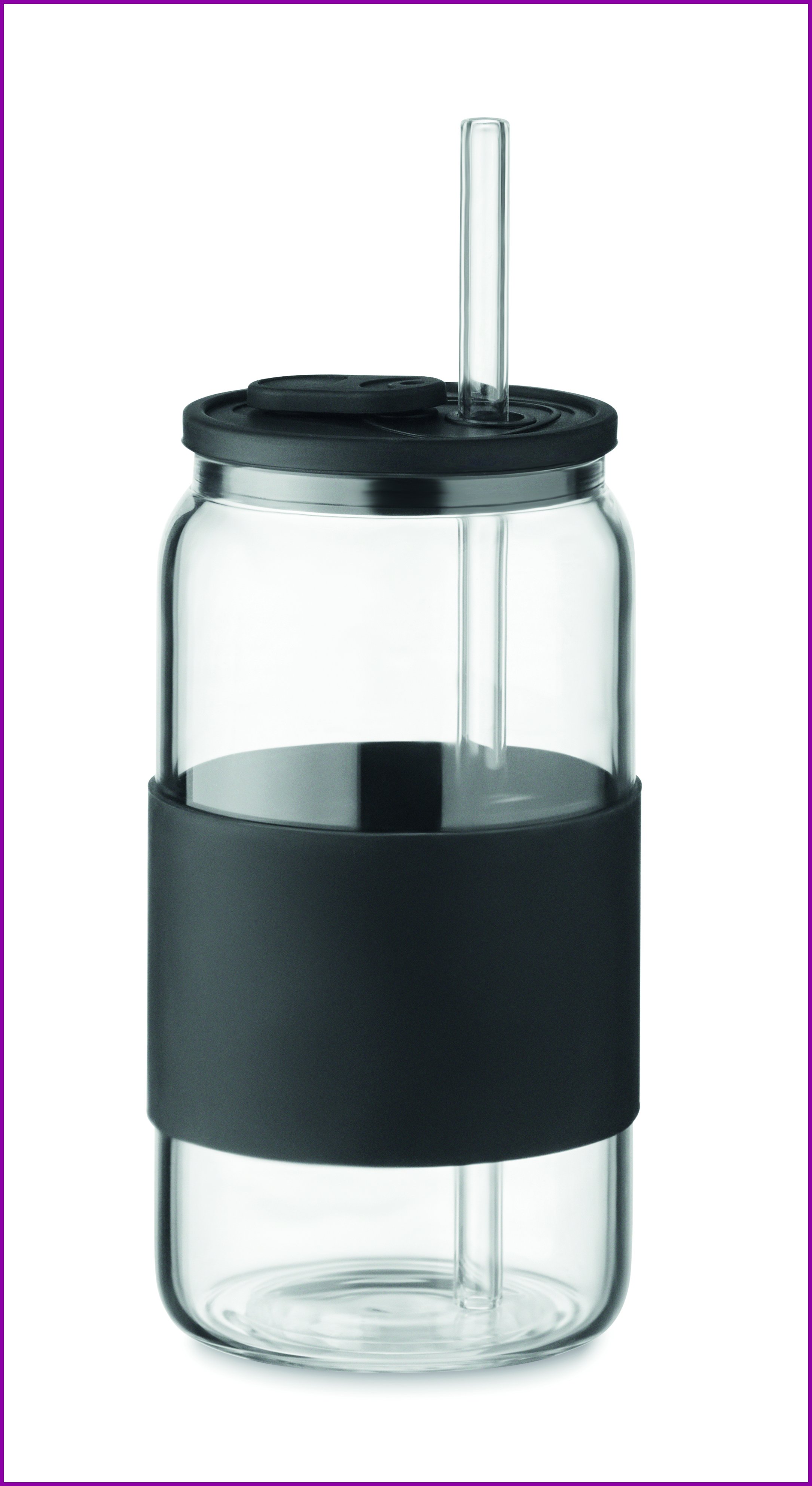 Korkeaborosilikaattilasinen juomalasi, jossa silikonikansi ja kahva. Sisältää borosilikaattilasin pillin. Tilavuus: 550 ml.