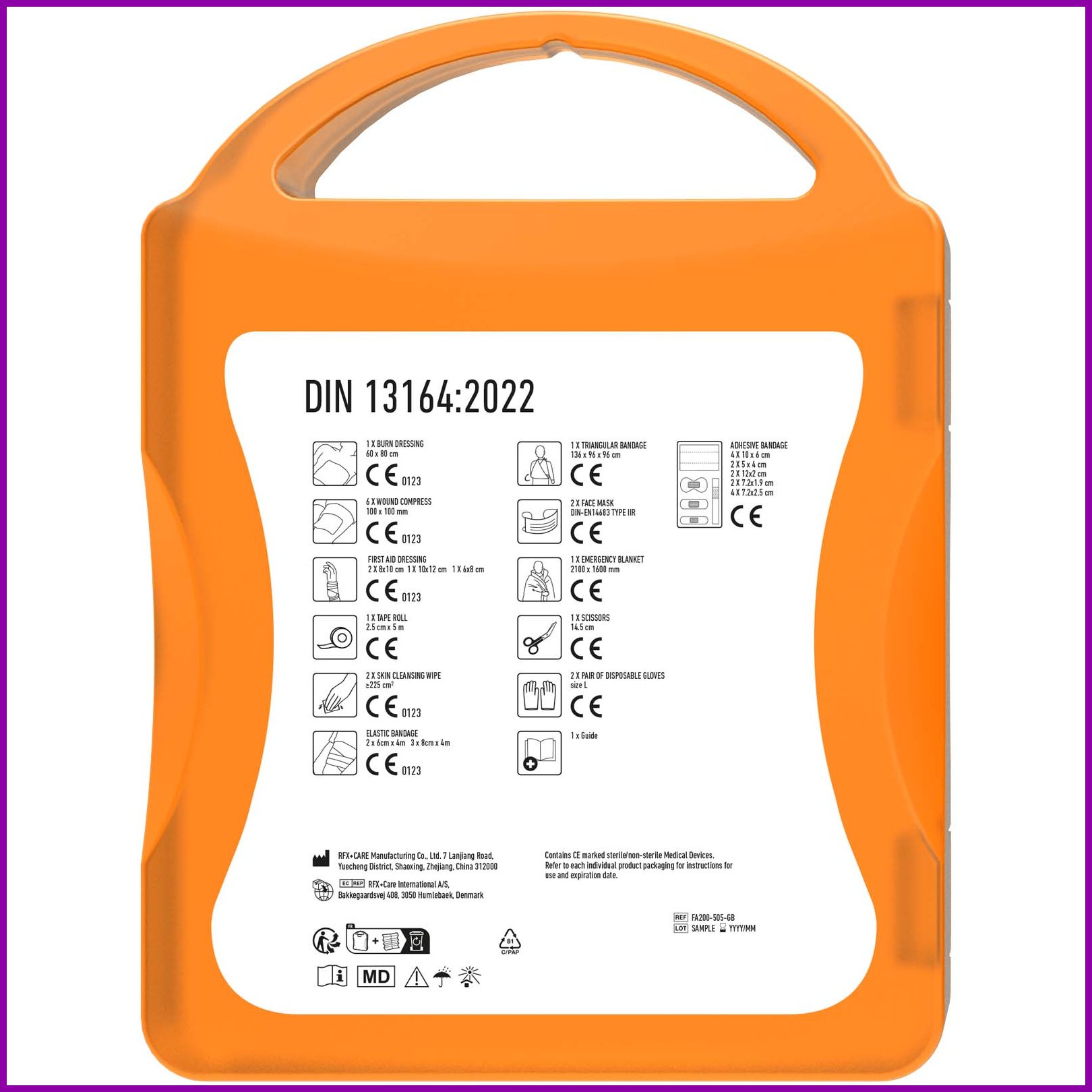 Ihanteellinen DIN-hyväksytty ensiapupakkaus jokaiseen autoon. Hyvin varustettu ensiapupakkaus on hyvä pitää mukana vammojen ja hätätilanteiden varalta. Sisältö: 3 ensiapusidettä (8 m x 10 cm), 1 ensiapuside (10 m x 12 cm), 2 palovammasidettä (40 x 60 cm), 1 palovammaside (60 x 80 cm), 3 haavakompressiosidettä, 2 elastista sidettä (4 m x 6 cm), 3 elastista sidettä (4 m x 8 cm), 1 sakset, 1 ensiapuohje, 1 teippirulla, 8 itsekiinnittyvää sidettä, 2 paria kertakäyttökäsineitä, 2 kolmisidettä, 1 ensiapuhuopa, 2 ihonpuhdistuspyyhettä, 2 sormilaastaria (70 x 40 mm), 2 sormilaastaria (120 x 20 mm) ja 2 laastaria (72 x 19 mm). Kaikki pakkauksen sisältämät ensiapu- ja hoitotuotteet täyttävät kaikki soveltuvat EU:n säännökset. Hinta sisältää täysväritulosteen.Värit ja Koot