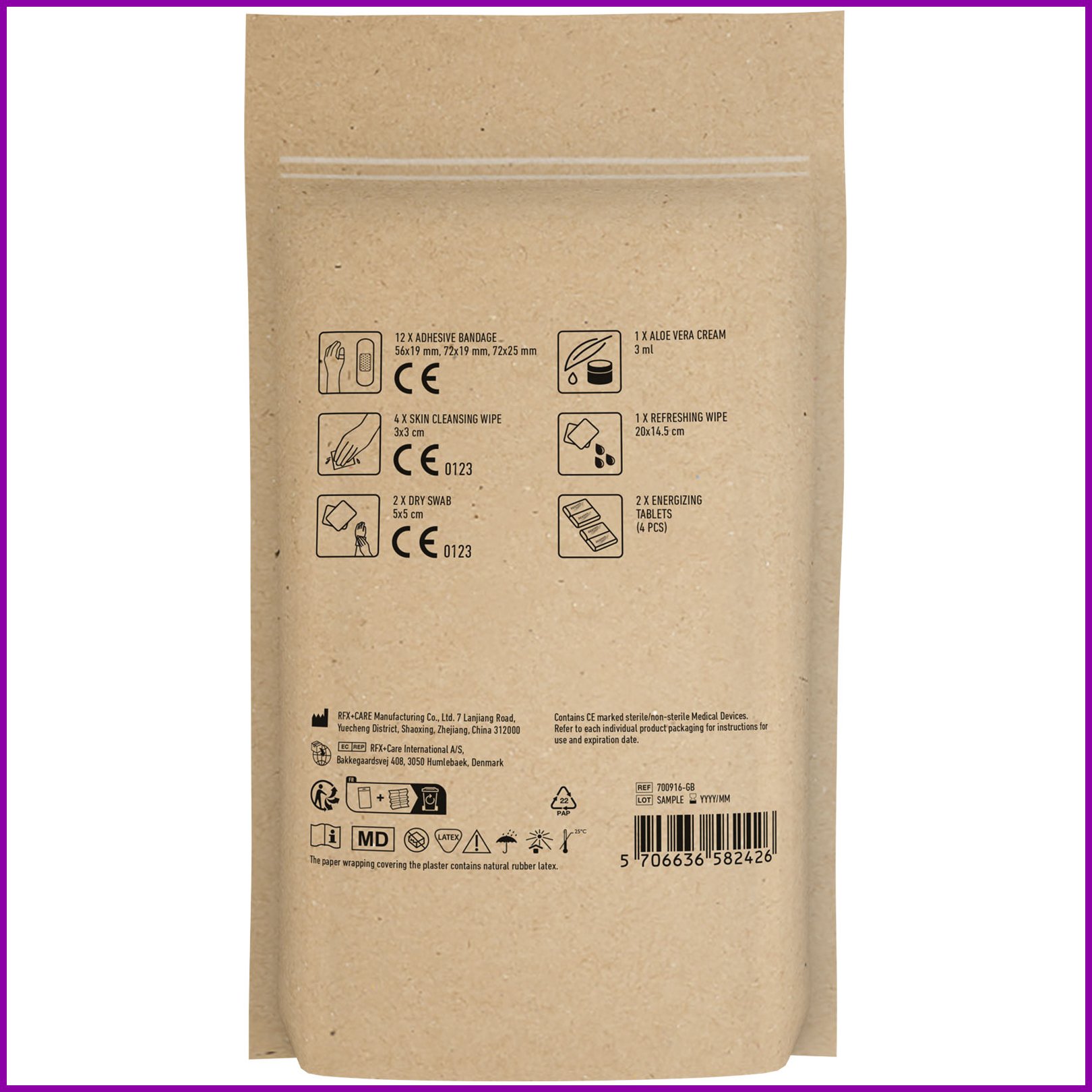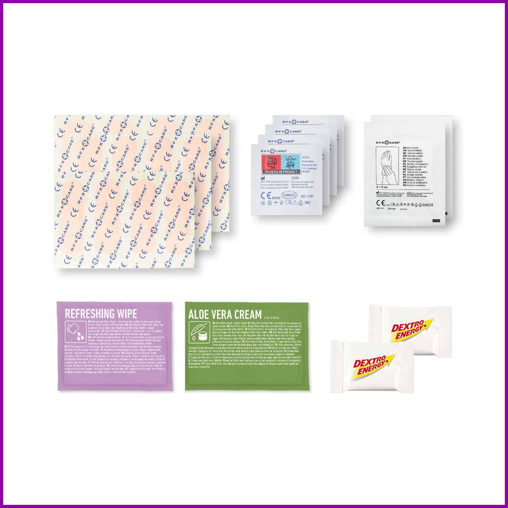 Ihanteellinen sarja, kun tarvitset lisäenergiaa. Tämä pakkaus virkistää ja antaa energiaa. Lisäksi voit varautua pieniin onnettomuuksiin ja vammoihin. Sisältö: 12 pesunkestävää laastaria, 2 energiatablettipakkausta (4 kpl per pakkaus), 1 kosteuspyyhe, 1 aloe vera -voide, 4 ihonpuhdistuspyyhettä ja 2 kuivapyyhettä. Kaikki pakkauksen sisältämät ensiapu- ja hoitotuotteet täyttävät kaikki soveltuvat EU:n säännökset. Hinta sisältää täysväritulosteen.