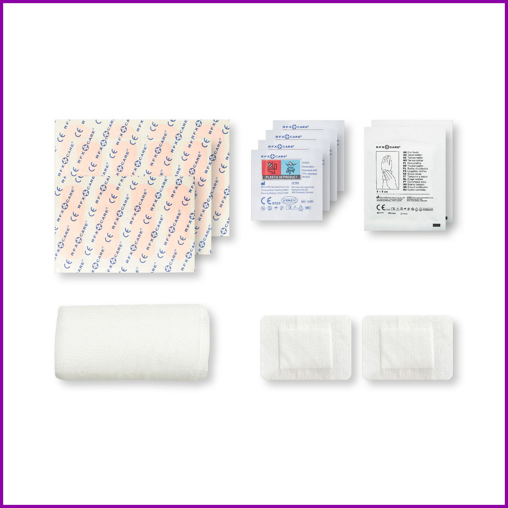Tätä perusensiapupakkaus on kätevä niin kotona kuin autossakin vammojen ja hätätilanteiden varalta. Sisältö: 12 pesunkestävää laastaria, 4 ihonpuhdistuspyyhettä, 2 kuivaa pyyhettä, 1 elastinen side ja 2 palovammatyynyä. Kaikki tämän pakkauksen ensiapu- ja hoitotuotteet täyttävät kaikki soveltuvat EU:n säännökset. Hinta sisältää täysväritulosteen.Värit ja Koot