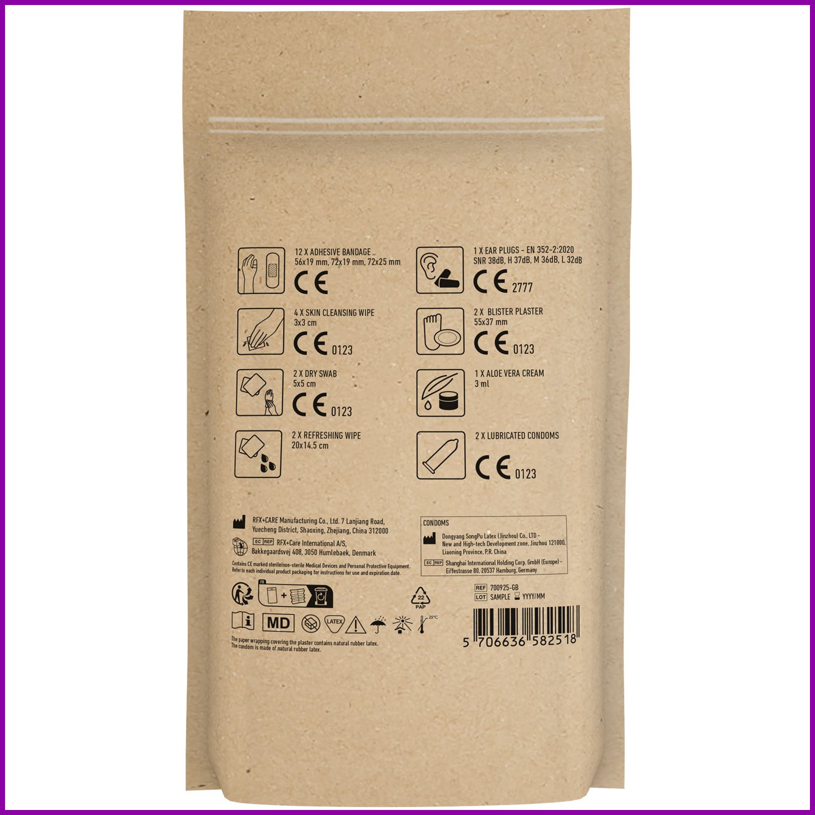 Täydellinen ensiapupakkaus festareille tai juhliin. Tämän pakkauksen avulla olet valmiina tilanteessa kuin tilanteessa sekä juhlissa että festareilla. Sisältö: 12 pesunkestävää laastaria, 4 ihonpuhdistuspyyhettä, 2 kuivapyyhettä, 2 kosteuspyyhettä, 2 kondomia, 1 rakkolaastari, 1 aloe vera -voide ja 2 korvatulpat. Kaikki pakkauksen sisältämät ensiapu- ja hoitotuotteet täyttävät kaikki soveltuvat EU:n säännökset. Hinta sisältää täysväritulosteen.
