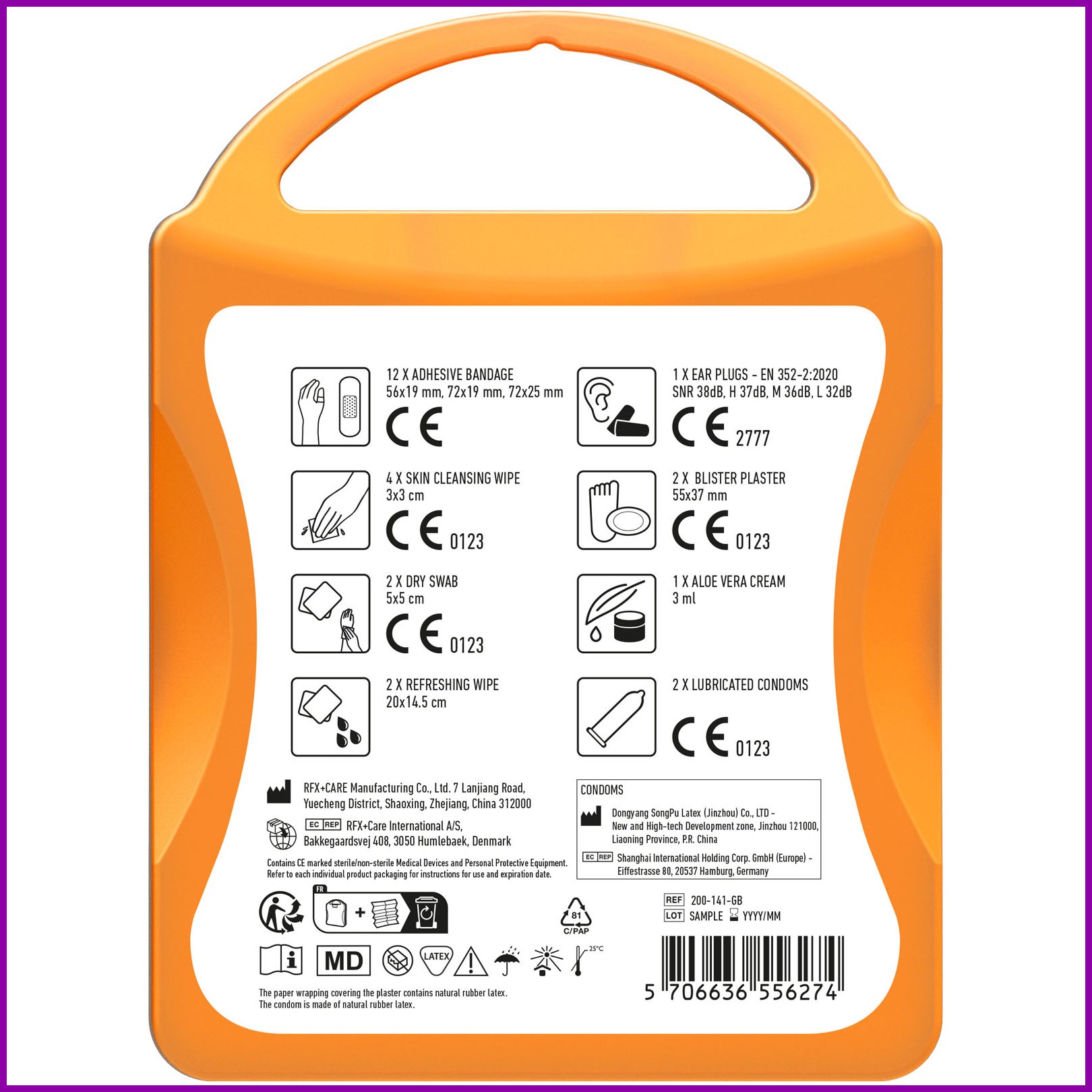 Täydellinen ensiapupakkaus festareille tai juhliin. Tämän pakkauksen avulla olet valmiina tilanteessa kuin tilanteessa sekä juhlissa että festareilla. Sisältö: 12 pesunkestävää laastaria, 4 ihonpuhdistuspyyhettä, 2 kuivapyyhettä, 2 kosteuspyyhettä, 2 kondomia, 1 rakkolaastari, 1 aloe vera -voide ja 2 korvatulpat. Kaikki pakkauksen sisältämät ensiapu- ja hoitotuotteet täyttävät kaikki soveltuvat EU:n säännökset. Hinta sisältää täysväritulosteen.