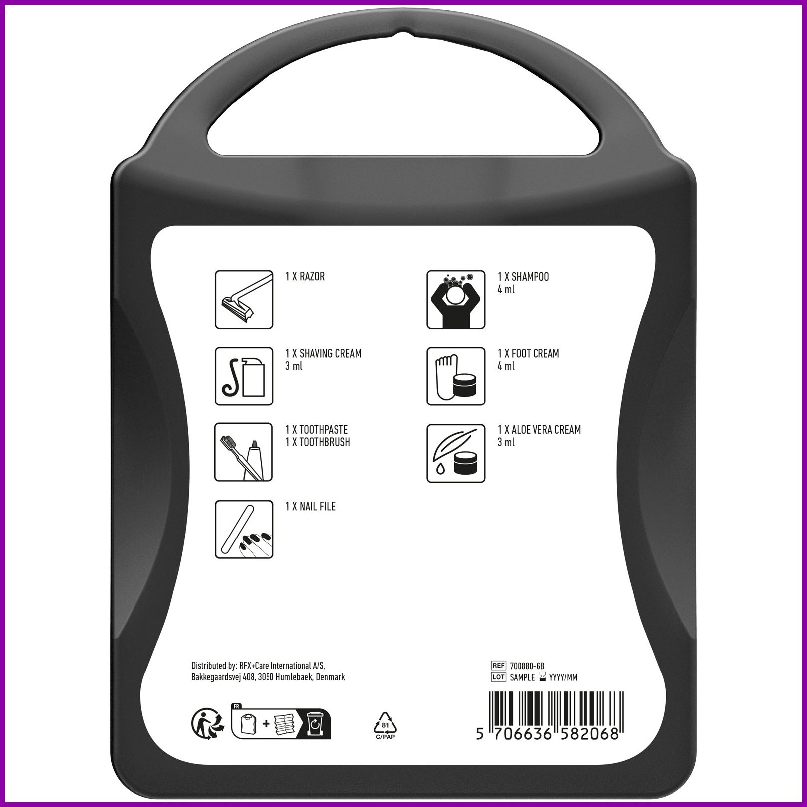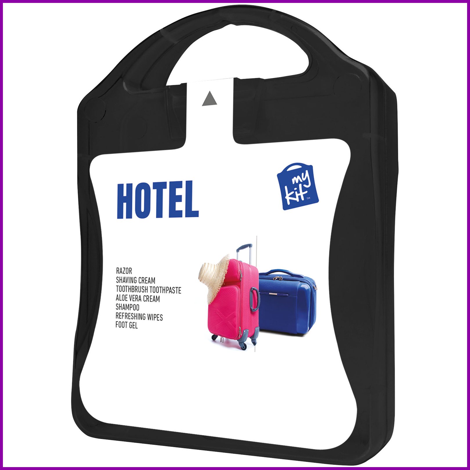 MyKit-hotellisetti on ihanteellinen liikematkoille tai pitkille messupäiville. Sisältö: 1 partaveitsi, 1 ajelugeeli, 1 aloe vera -voide, 1 shampoo, 1 jalkageeli, 1 kynsiviila, 1 hammasharja ja 1 hammastahna. Kaikki pakkauksen sisältämät ensiapu- ja hoitotuotteet täyttävät kaikki soveltuvat EU:n säännökset. Hinta sisältää täysväritulosteen.