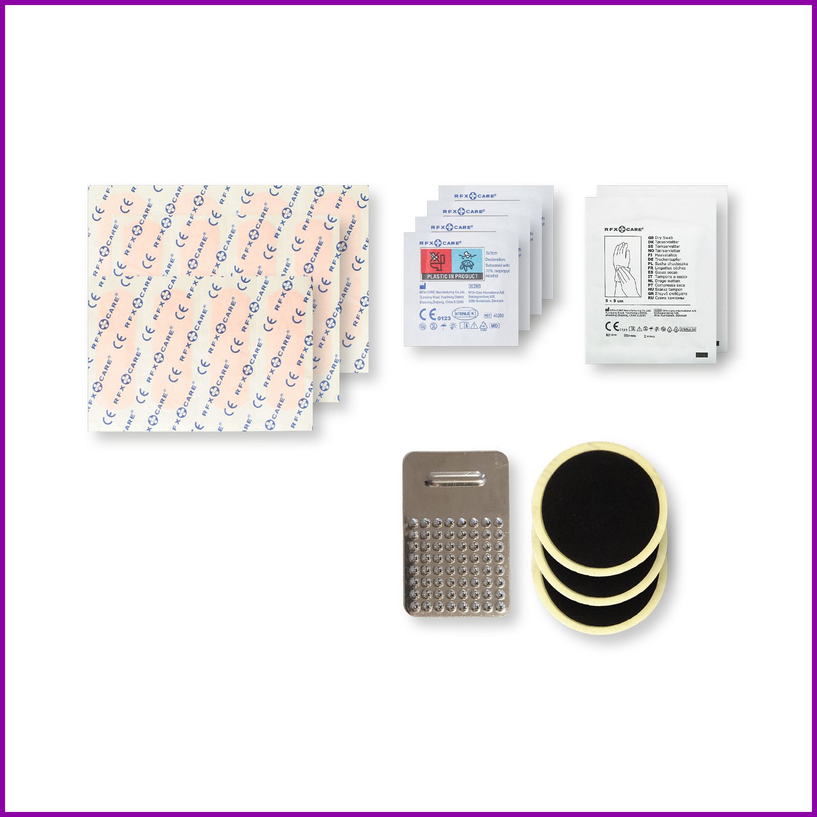 Ihanteellinen sarja pyöräretkiä varten. Varaudu pieniin vammoihin ja rengasrikkoihin. Sisältö: 12 pesunkestävää laastaria, 4 ihonpuhdistuspyyhettä, 2 kuivapyyhettä ja 1 korjaussarja. Kaikki pakkauksen sisältämät ensiapu- ja hoitotuotteet täyttävät kaikki soveltuvat EU:n säännökset. Hinta sisältää täysväritulosteen.Värit ja Koot
