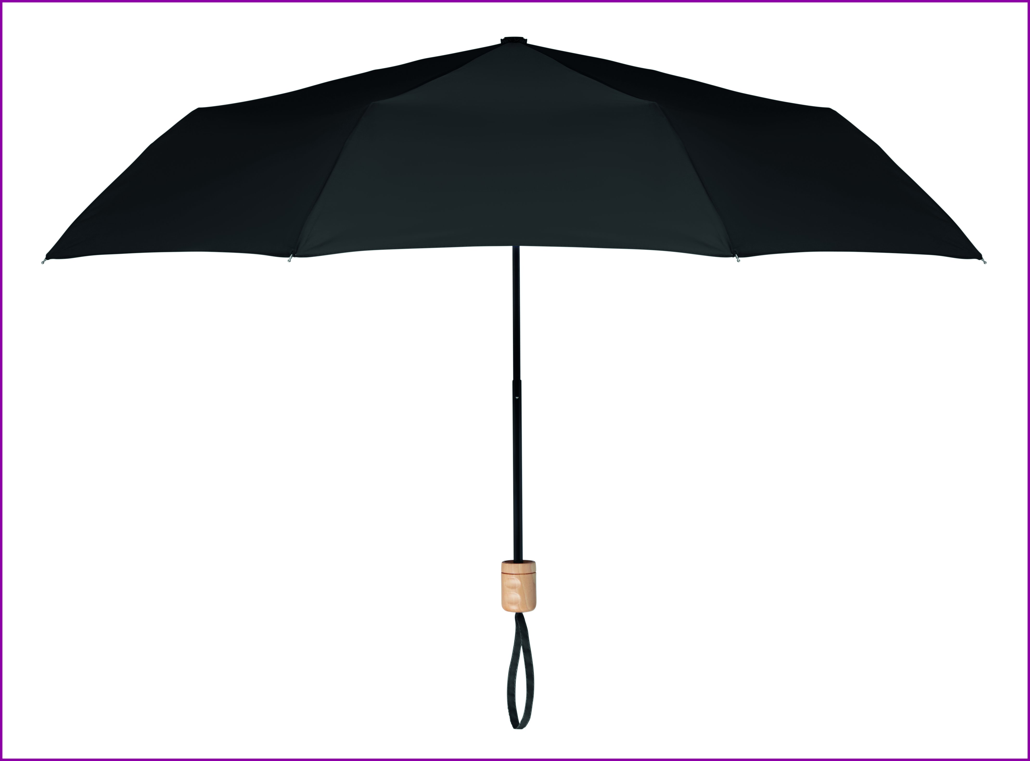 190T RPET-pongee 21 tuuman kokoontaitettava myrskysateenvarjo. Mustalla päällystetty runko ja ruoteet, puinen kahva. Manuaalinen avaus / suljin, sisältää yhteensopivan säilytyspussin.