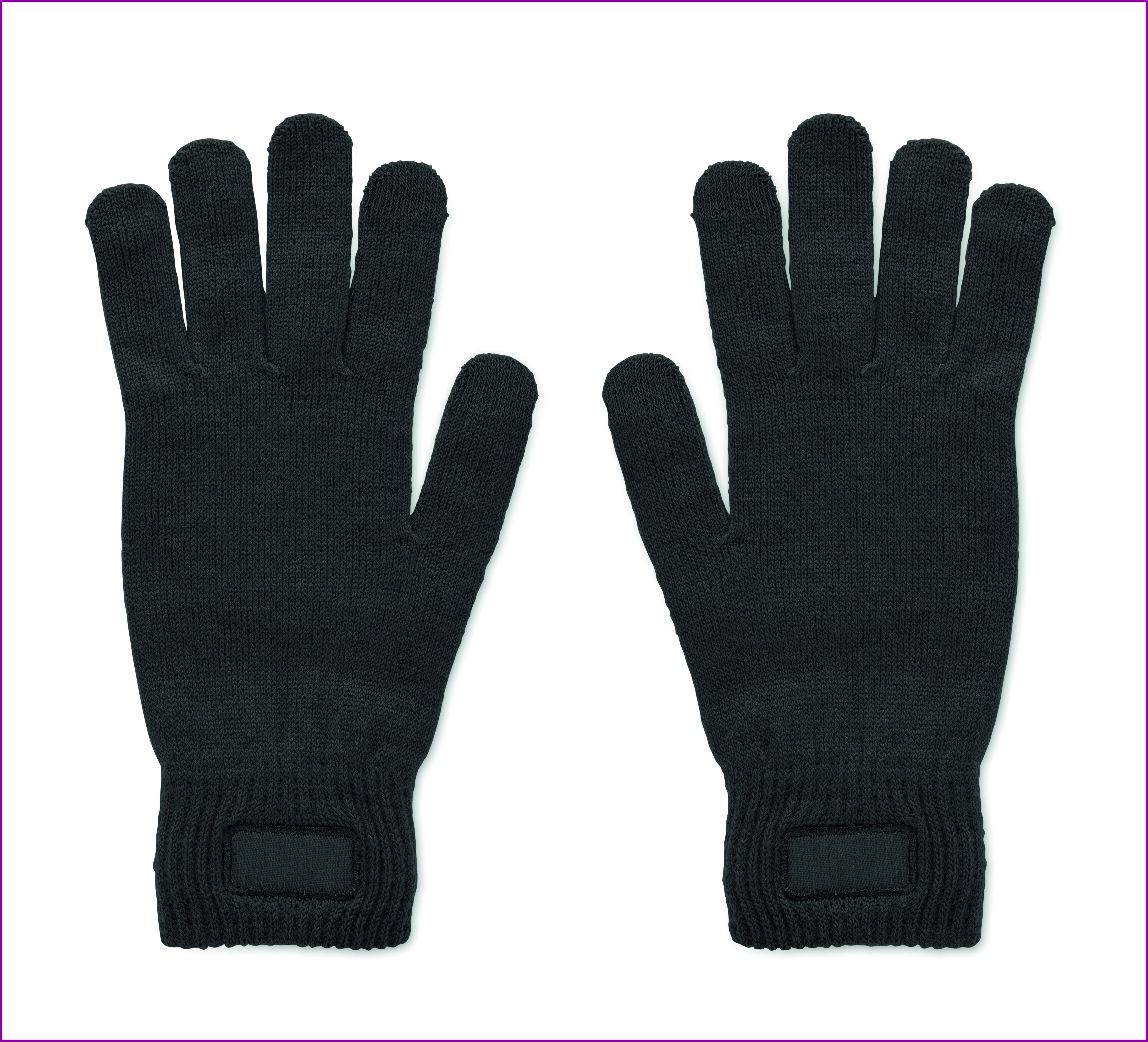 Neulotut käsineet pehmeästä joustavasta RPET-polyesteristä, joissa on kangasmerkki painatusta varten.