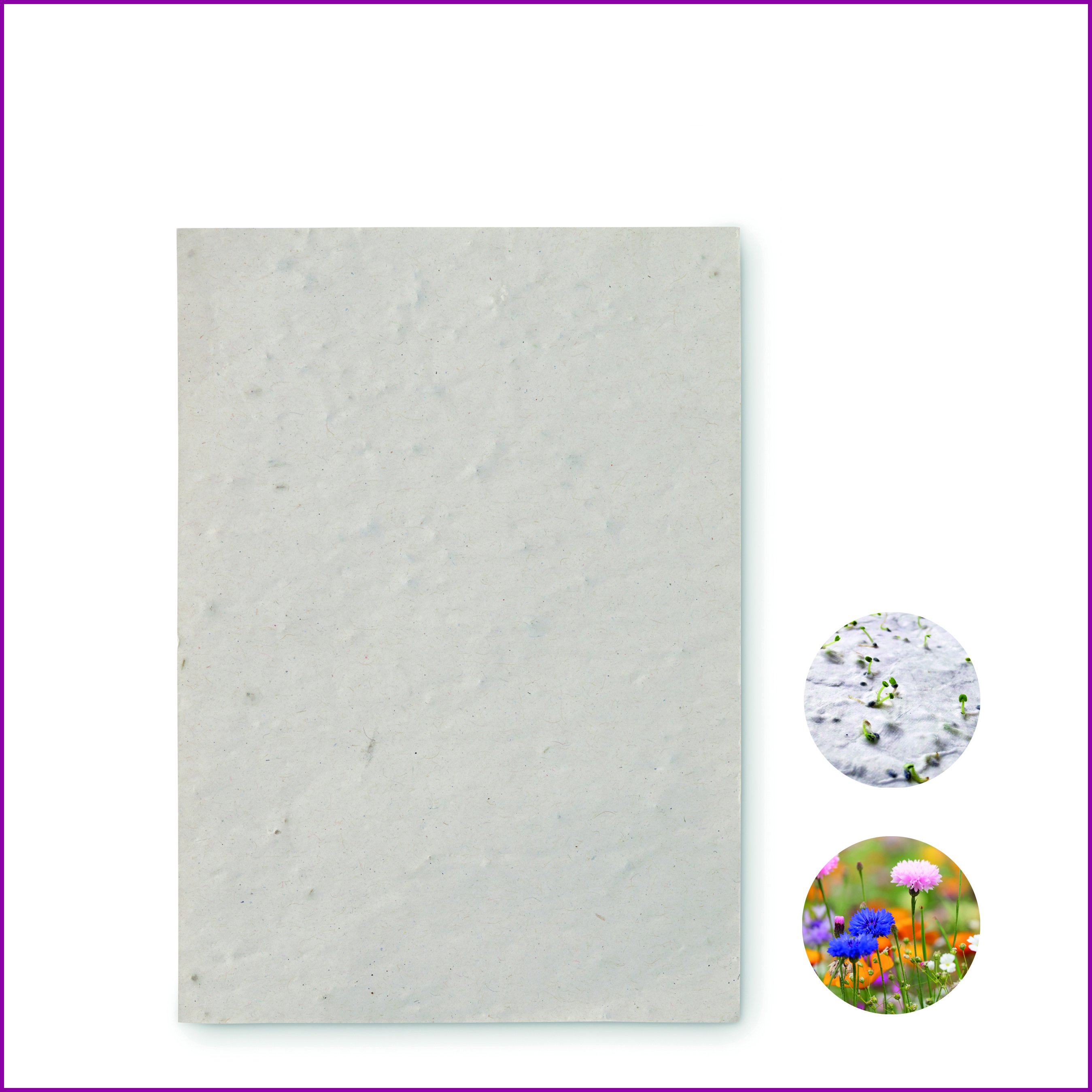 Niittykukkien siemeniä kierrätyspaperista valmistetussa A6 arkissa (80 gr/m²). Valmistettu EU:ssa.