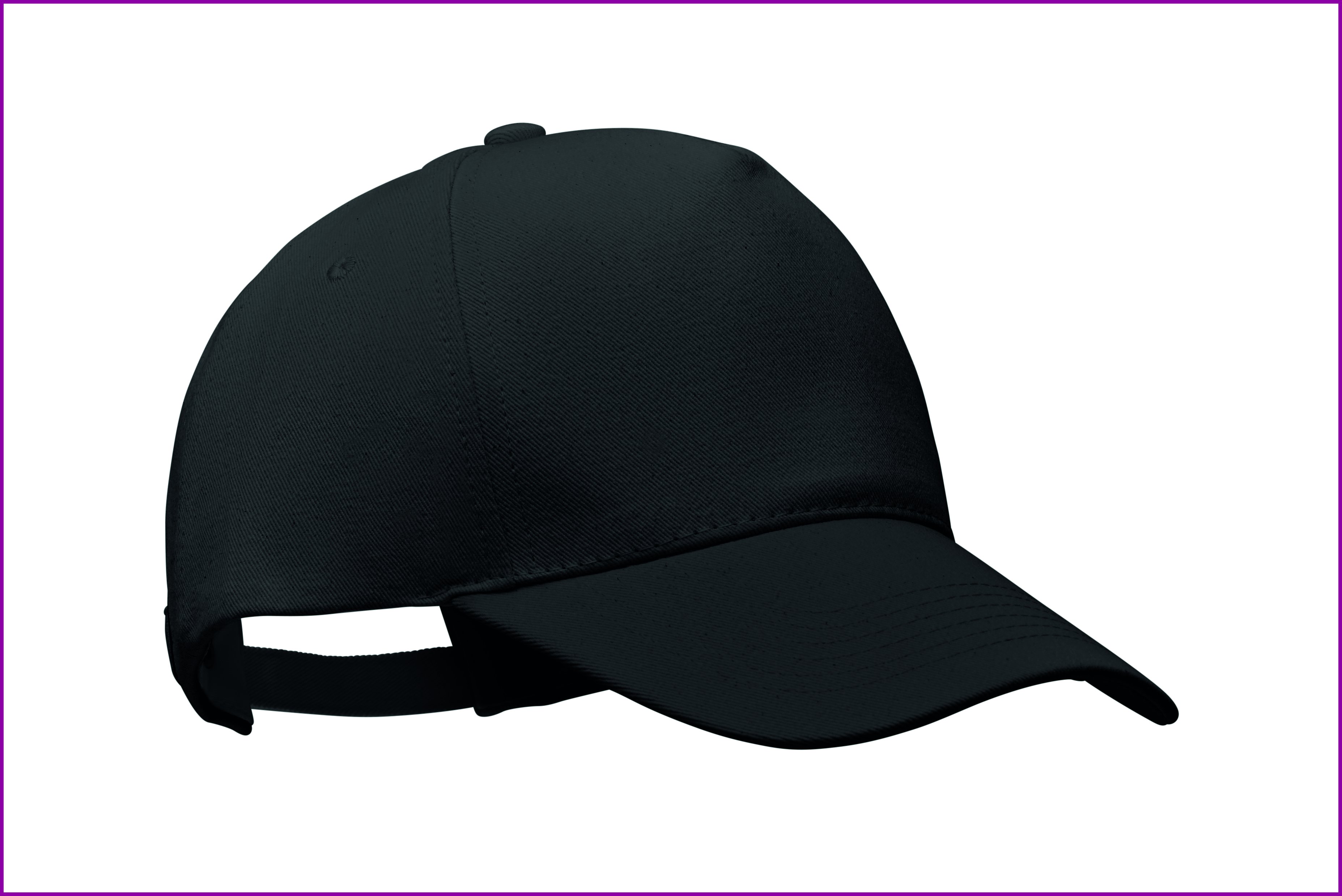 5 panel baseball cap in 250 gr/m² organic brushed cotton with metal adjustable strap back buckle closure.
