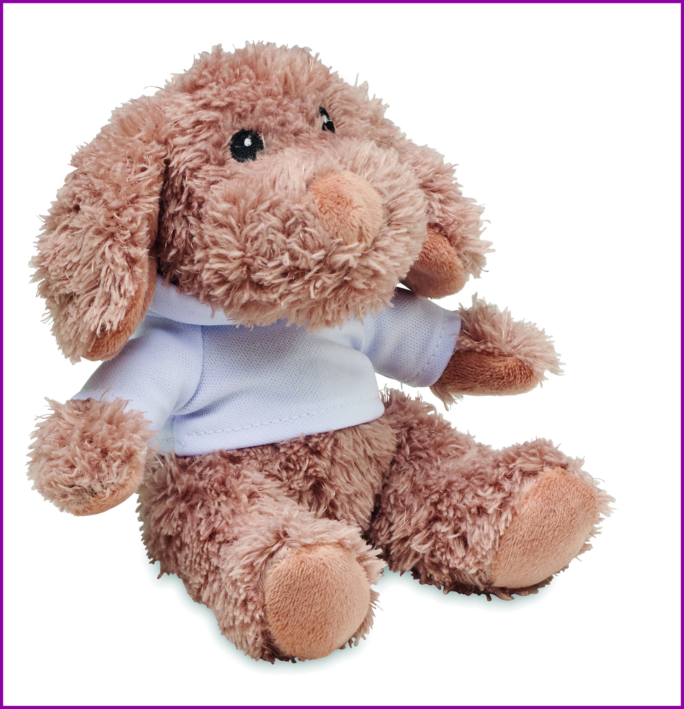 Koira pehmolelu, jolla on hupullinen paita. Ihanteellinen sublimaatiopainatusta varten.