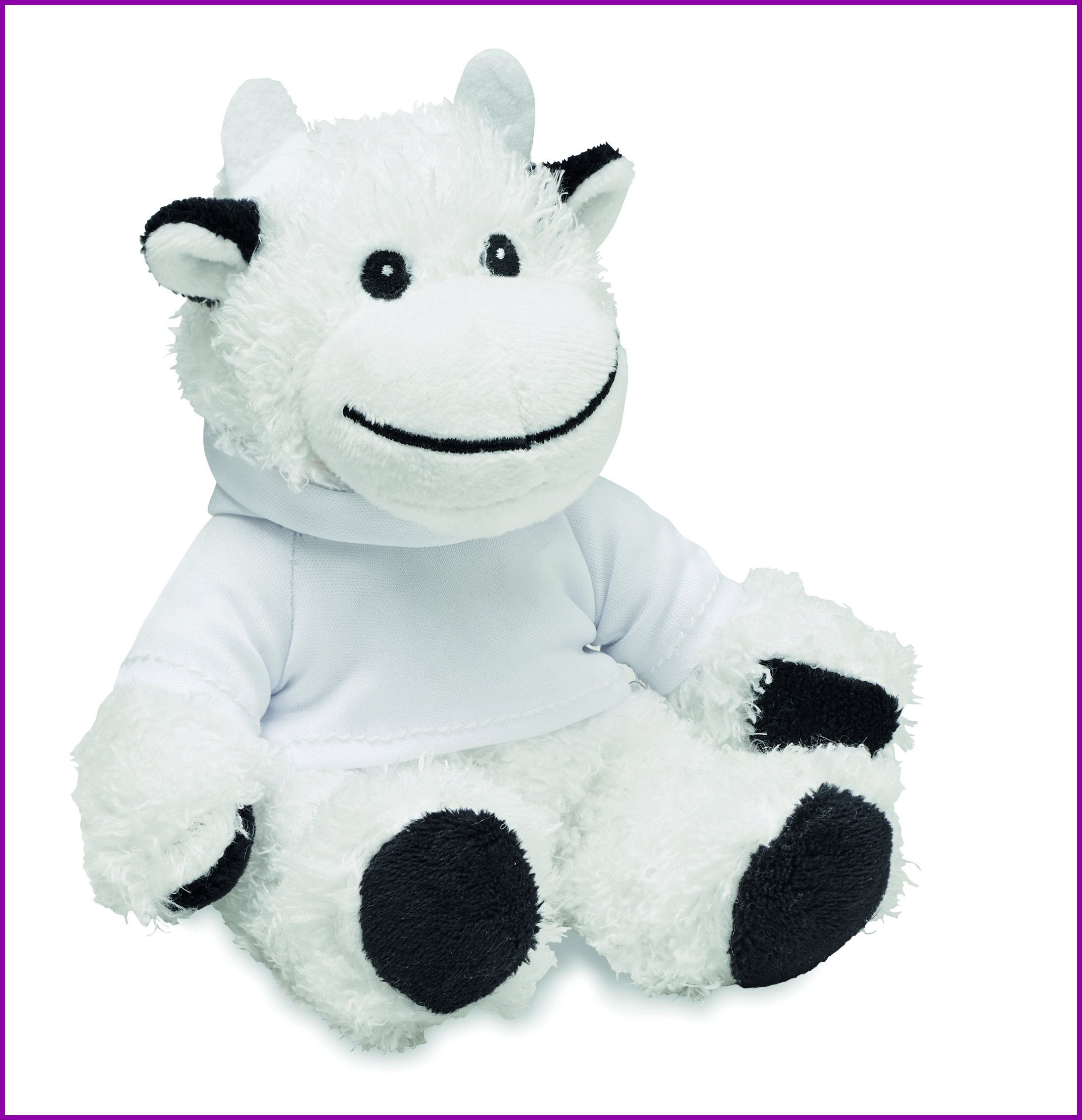 Lehmä pehmolelu, jolla on hupullinen paita. Ihanteellinen sublimaatiopainatusta varten.