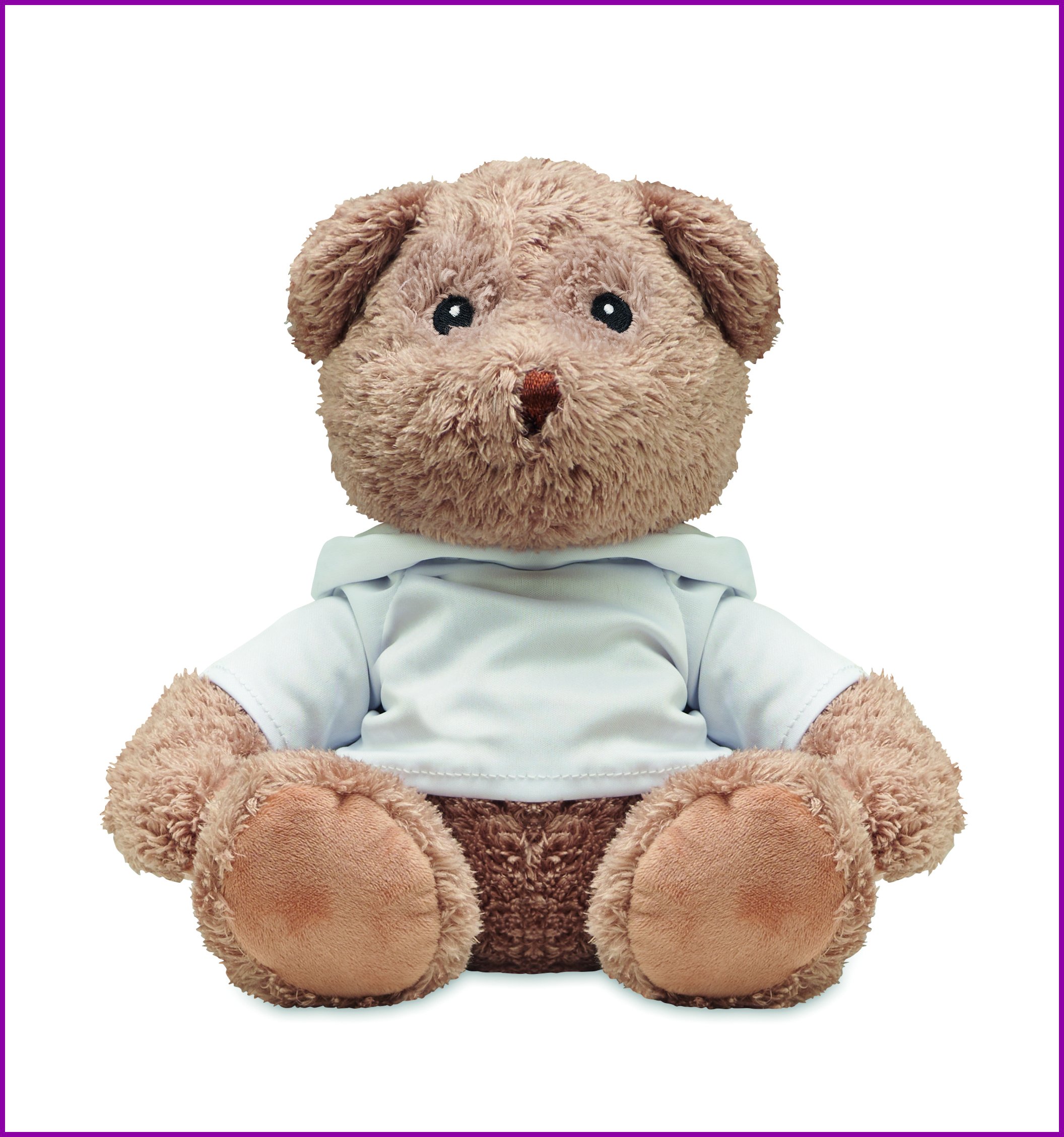 Iso nalle pehmolelu, jolla on hupullinen paita. Ihanteellinen sublimaatiopainatusta varten.