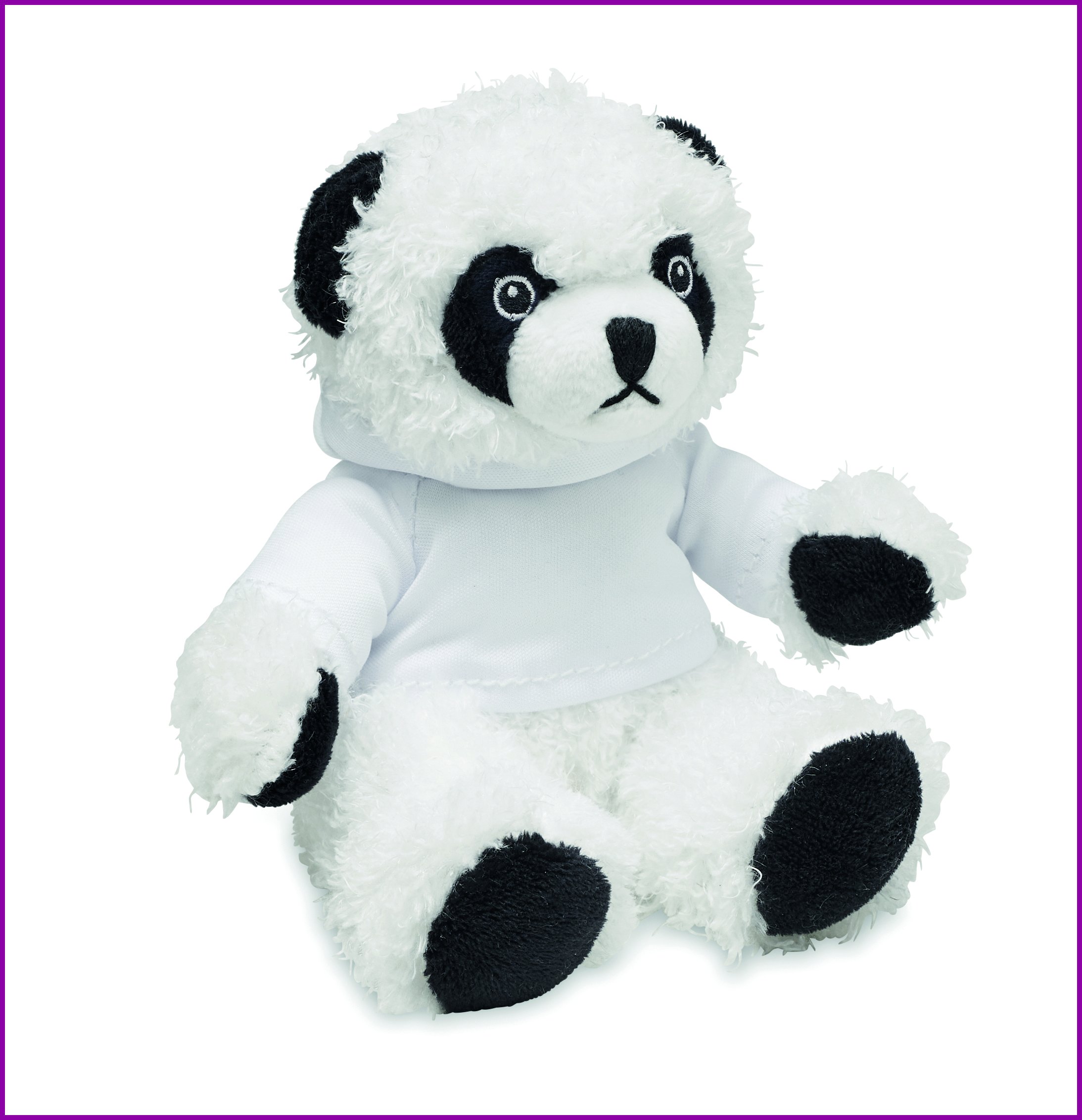 Pandakarhu pehmolelu, jolla on hupullinen paita. Ihanteellinen sublimointipainatusta varten.