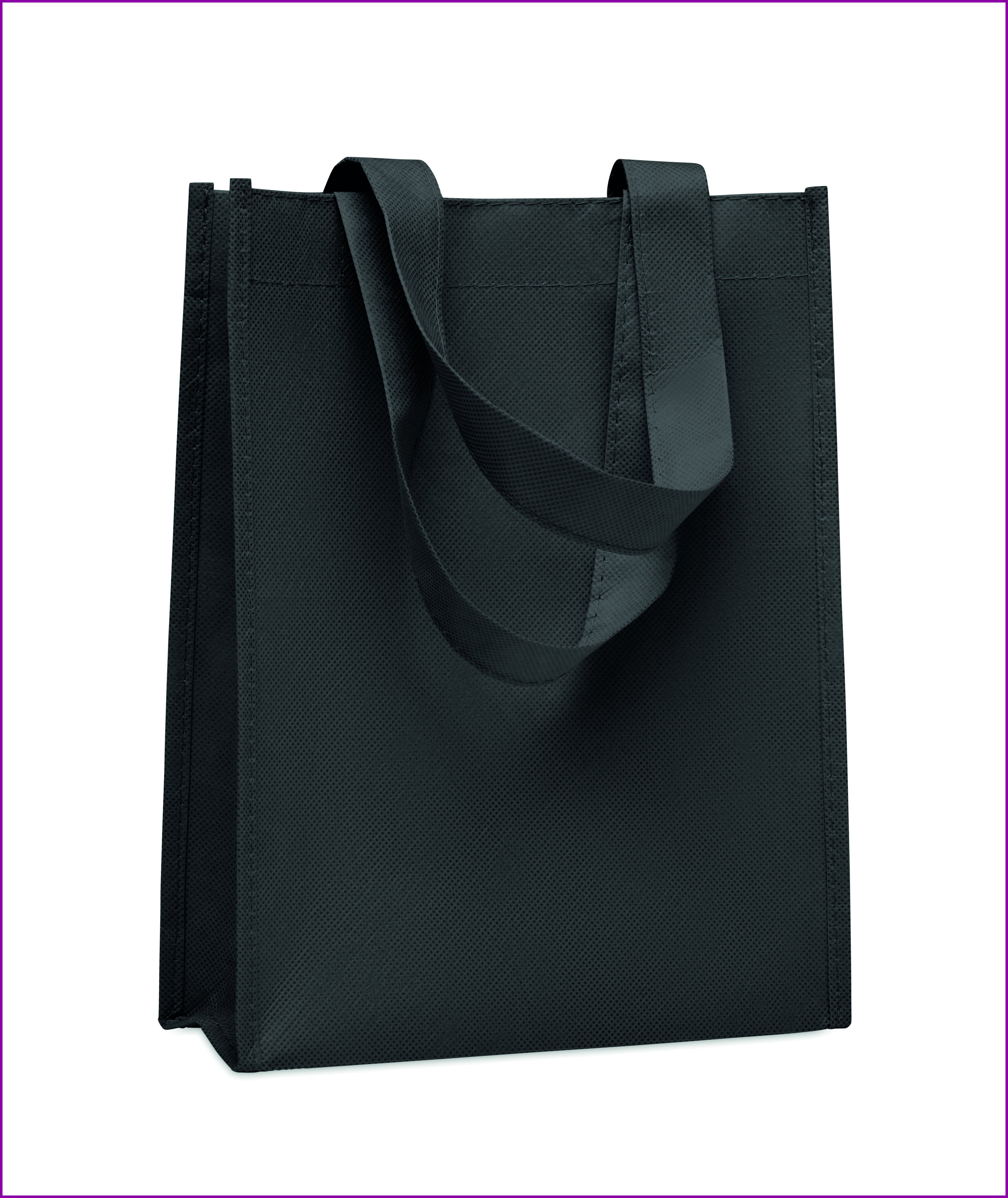 Pieni lahja- tai herkkupussi RPET-kuitukankaasta, jossa lyhyet kahvat ja sivukaitaleet. 80 g/m².