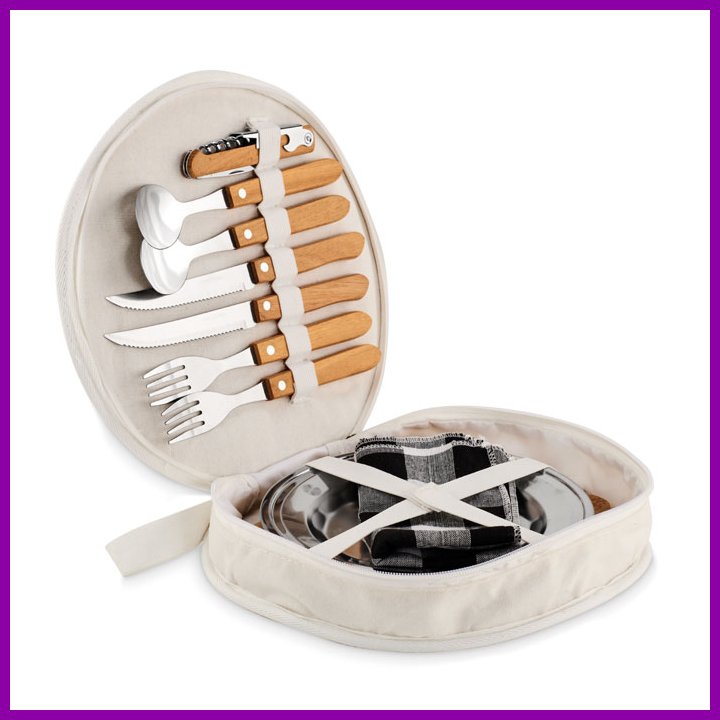 Aterinsetti kahdelle hengelle. Sisältää haarukat, veitset, lusikat ja pullonavaajan ruostumattomasta teräksestä ja bambusta. Toimitetaan puuvillapussissa.