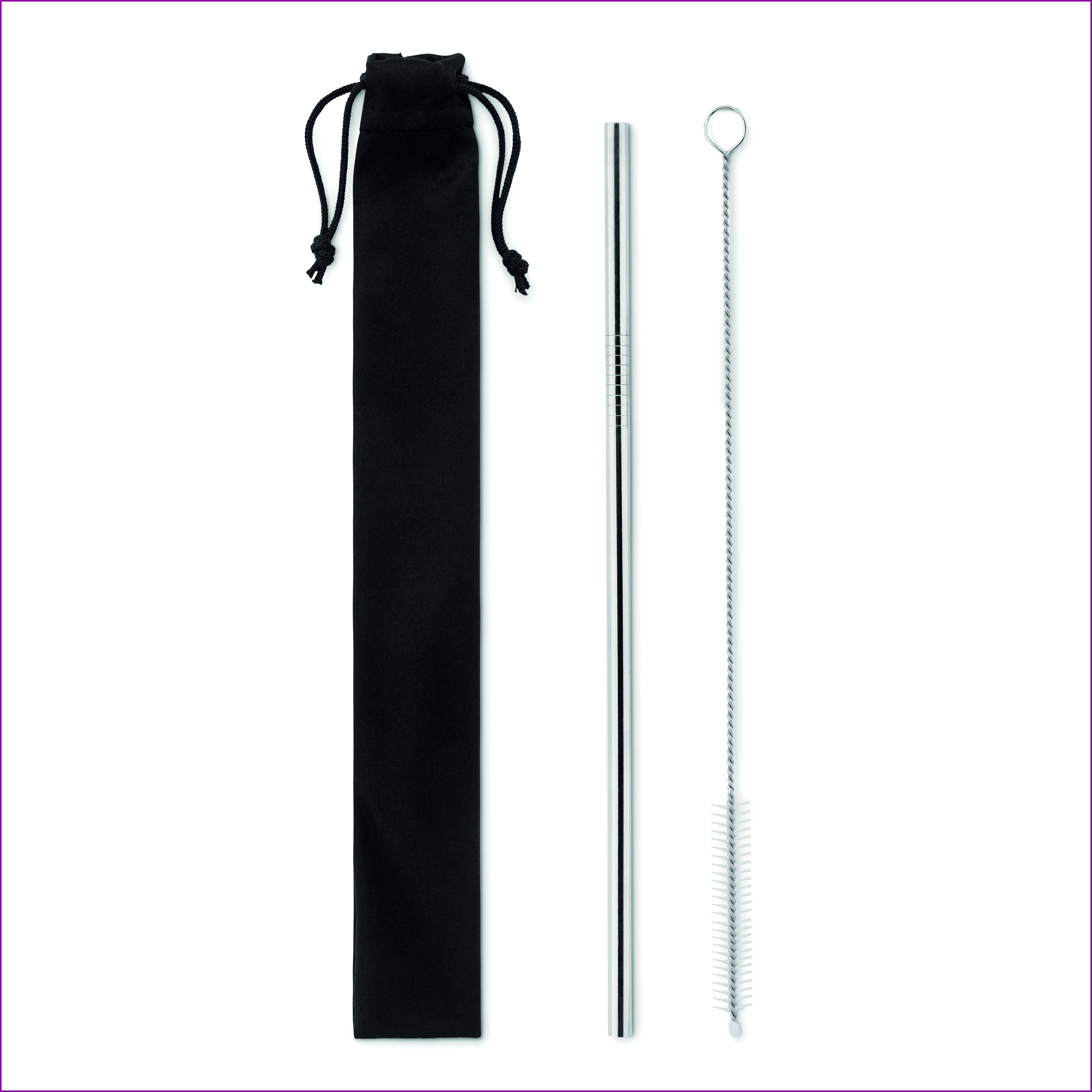 Ruostumattomasta teräksestä valmistettua pilli ja puhdistusharja mikrokuitupussissa.