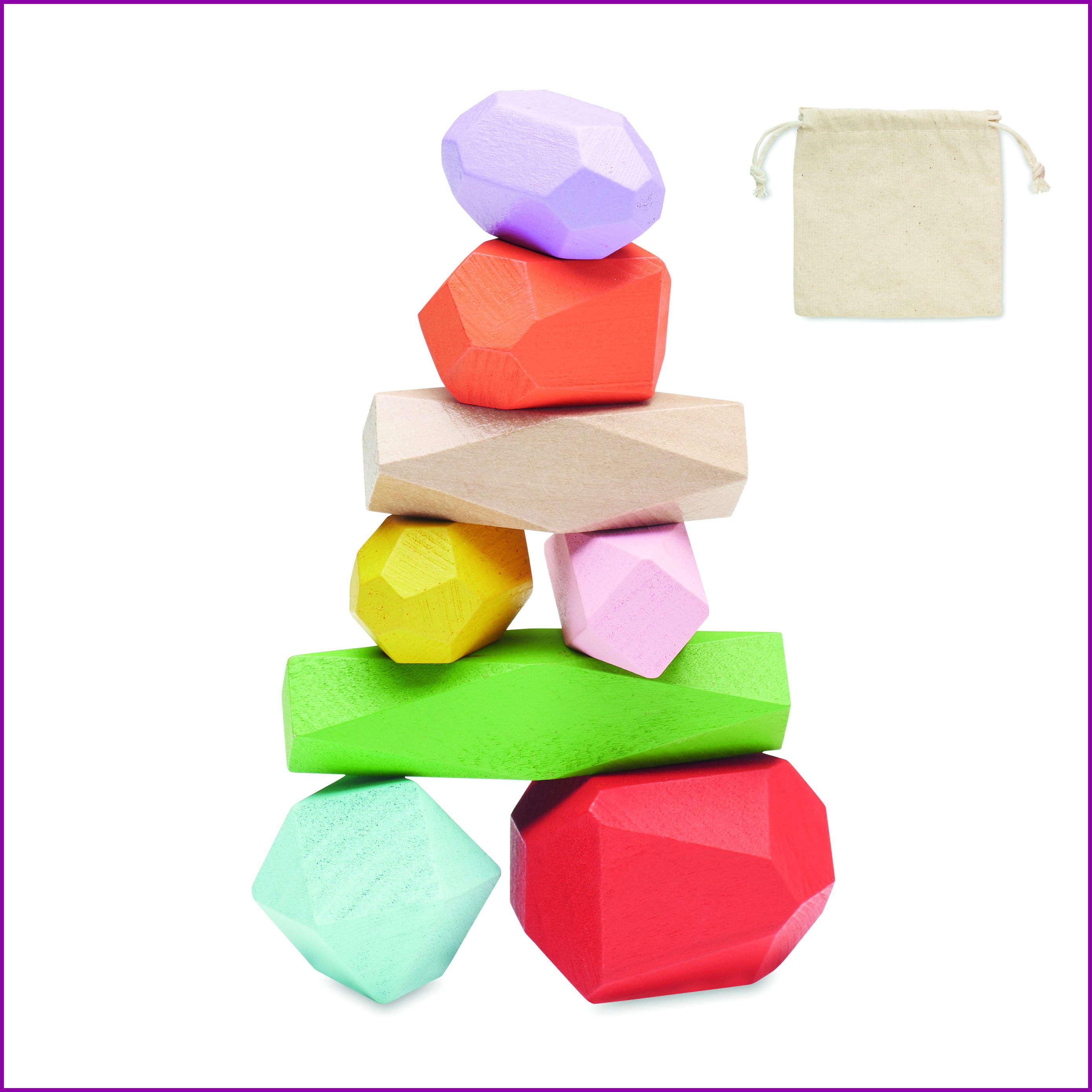 Kahdeksan värillistä, puusta tehtyä pinottavaa kiveä puuvillapussissa.