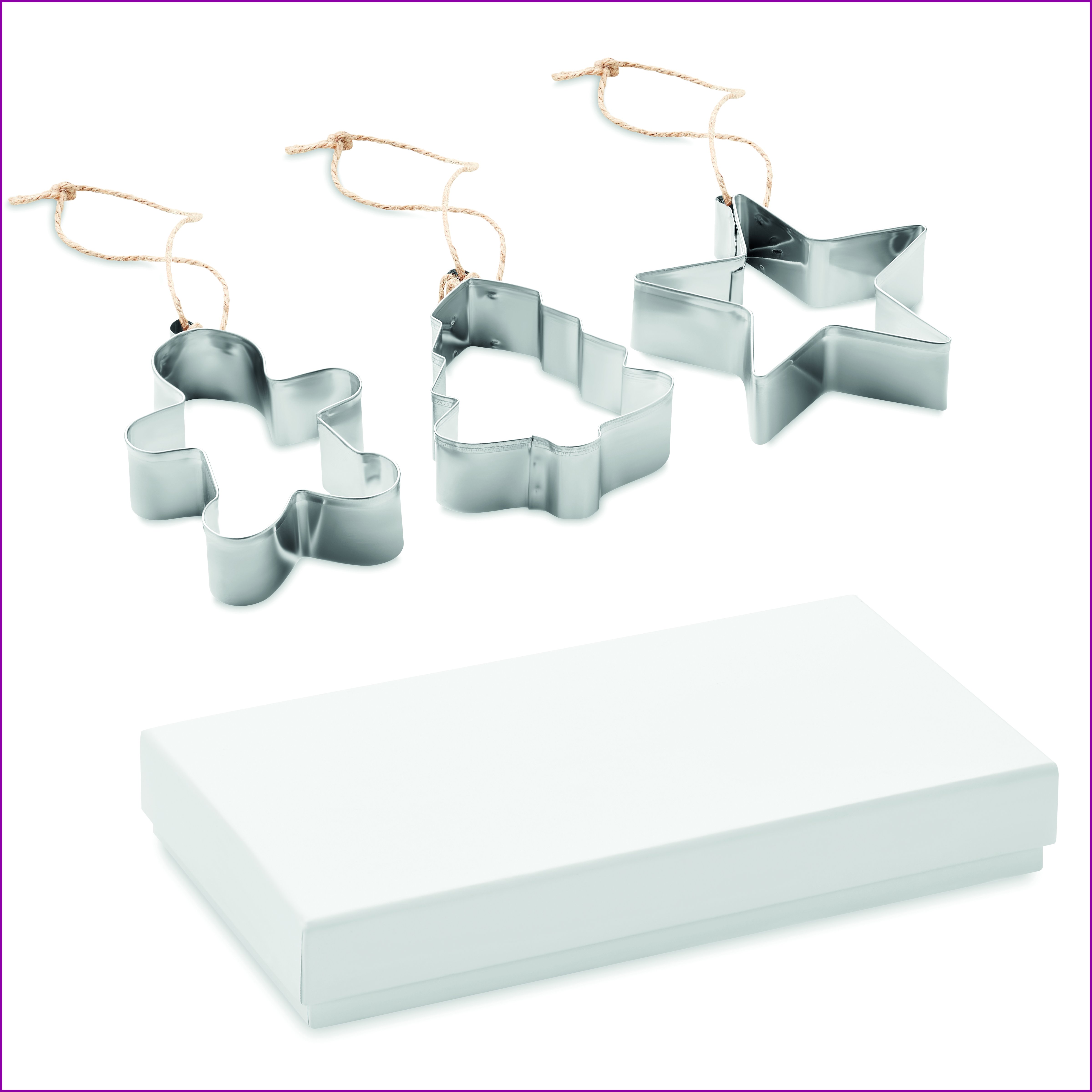 Ruostumattomasta teräksestä valmistettu piparimuottisetti juuttiripustimilla.