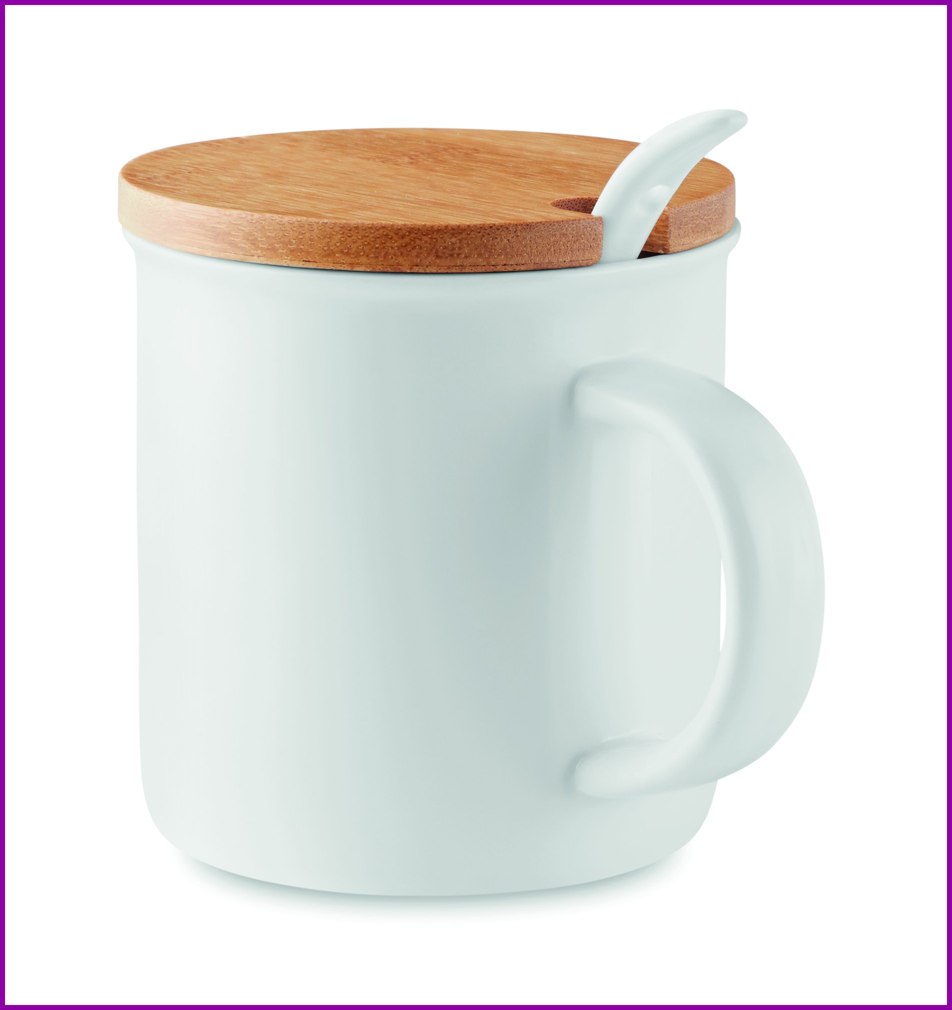 Posliininen 380 ml muki lusikalla ja bambu kannella. Luonnollisen materiaalin (bambu) vuoksi, tuotteiden värissä/ koossa saattaa olla erinäisyyksiä ja tämä voi vaikuttaa painatuksen lopputulokseen.