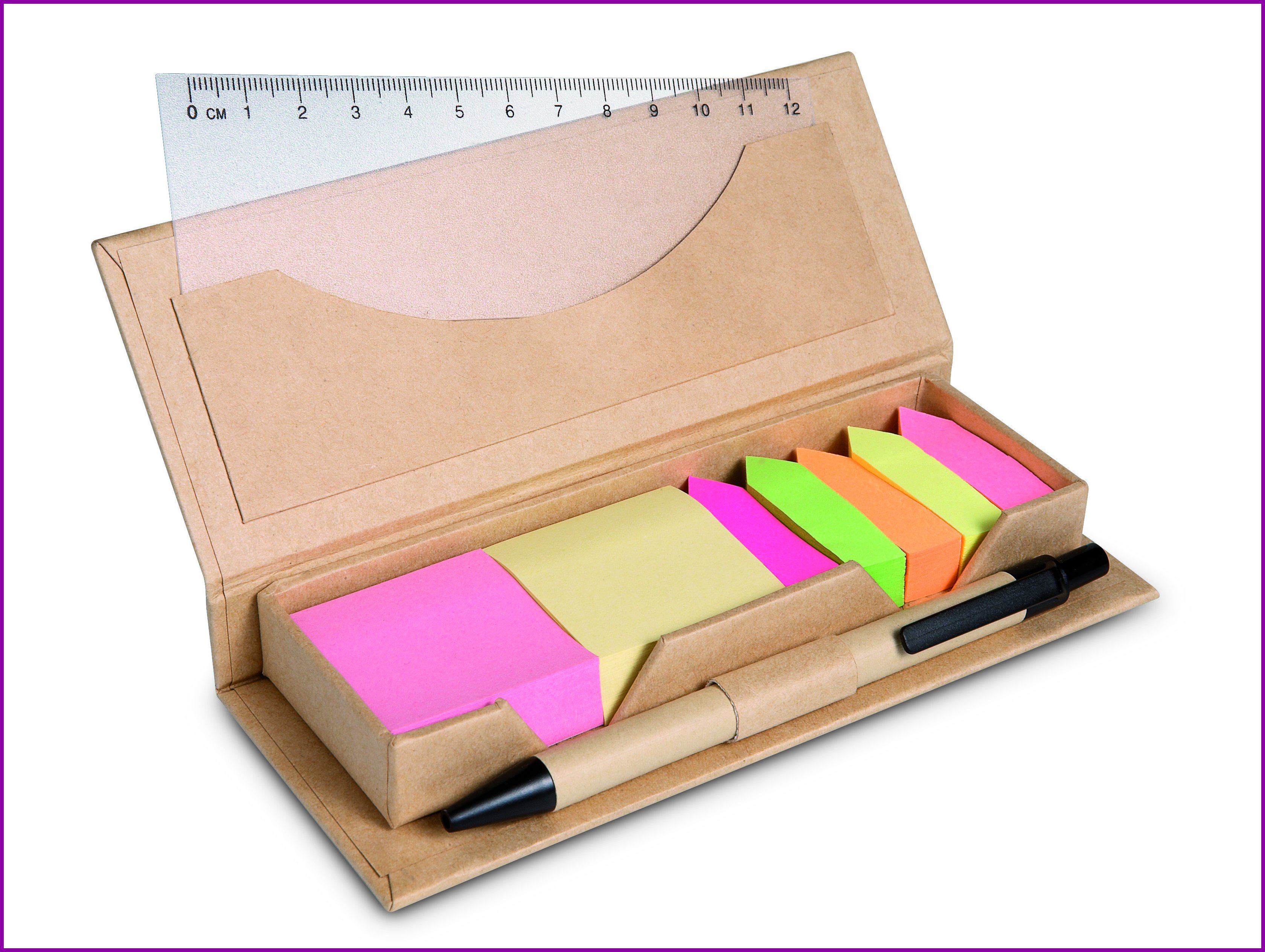 Muistilappusetti kartonkikotelossa, sisältää 2 värillistä muistilappua ja 5 eri väristä indeksi tarralappua, 12cm PP- muovisen viivoittimen, kuulakärkikynän sinisellä musteella.