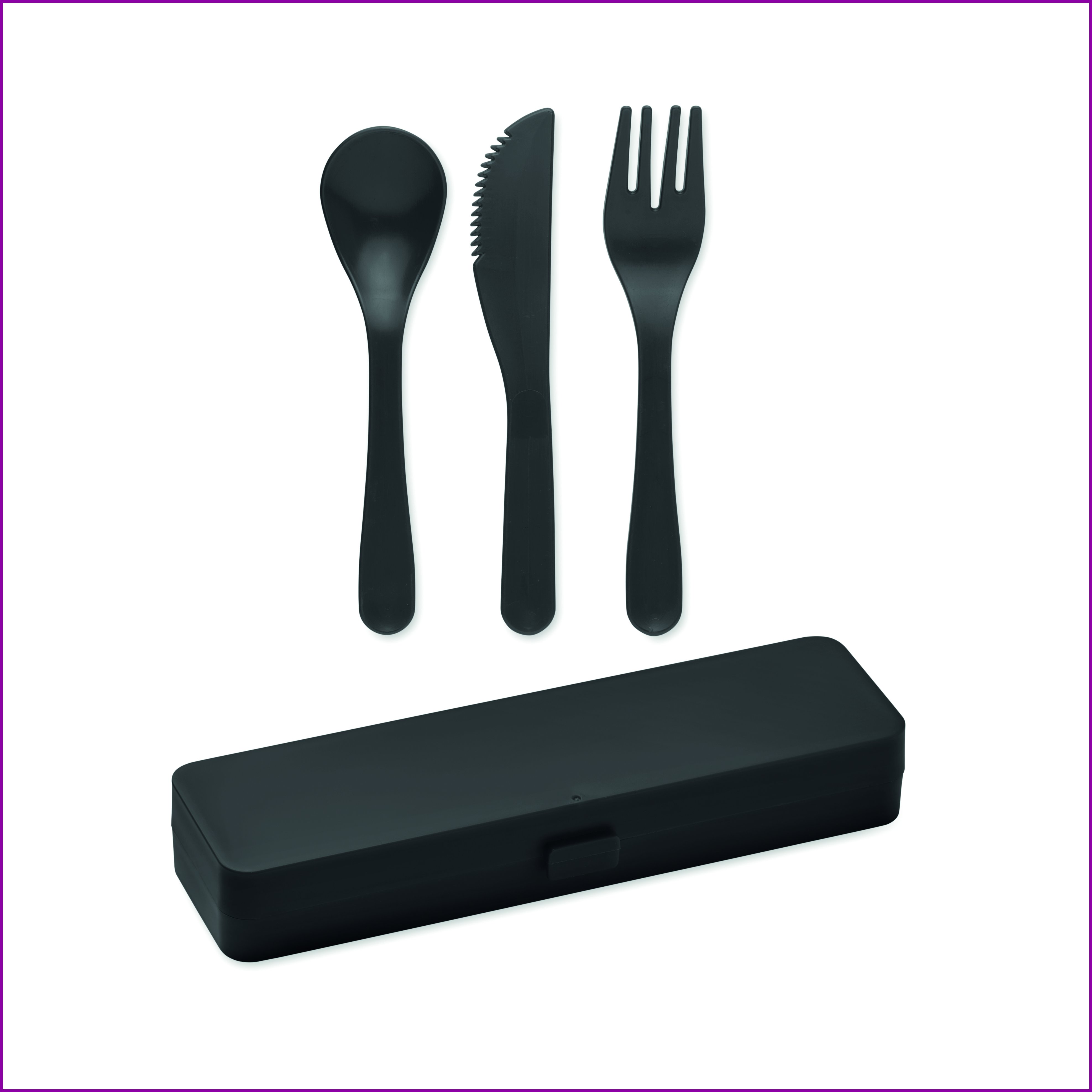 Uudelleenkäytettävä PP valmistettu ruokailuvälinesetti, sisältää lusikan, haarukan ja veitsen.