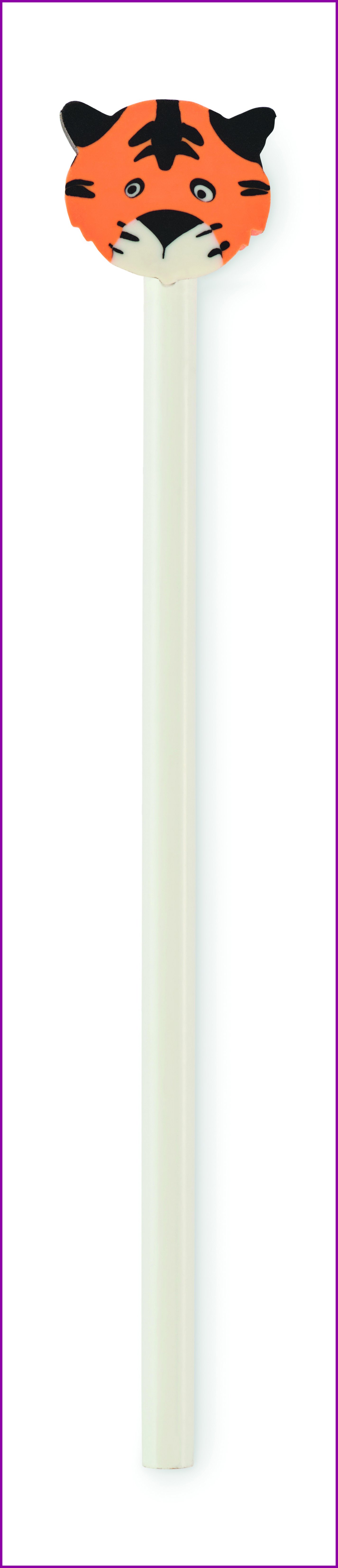 Puinen lyijykynä, jossa on eläimen muotoinen pyyhekumi.