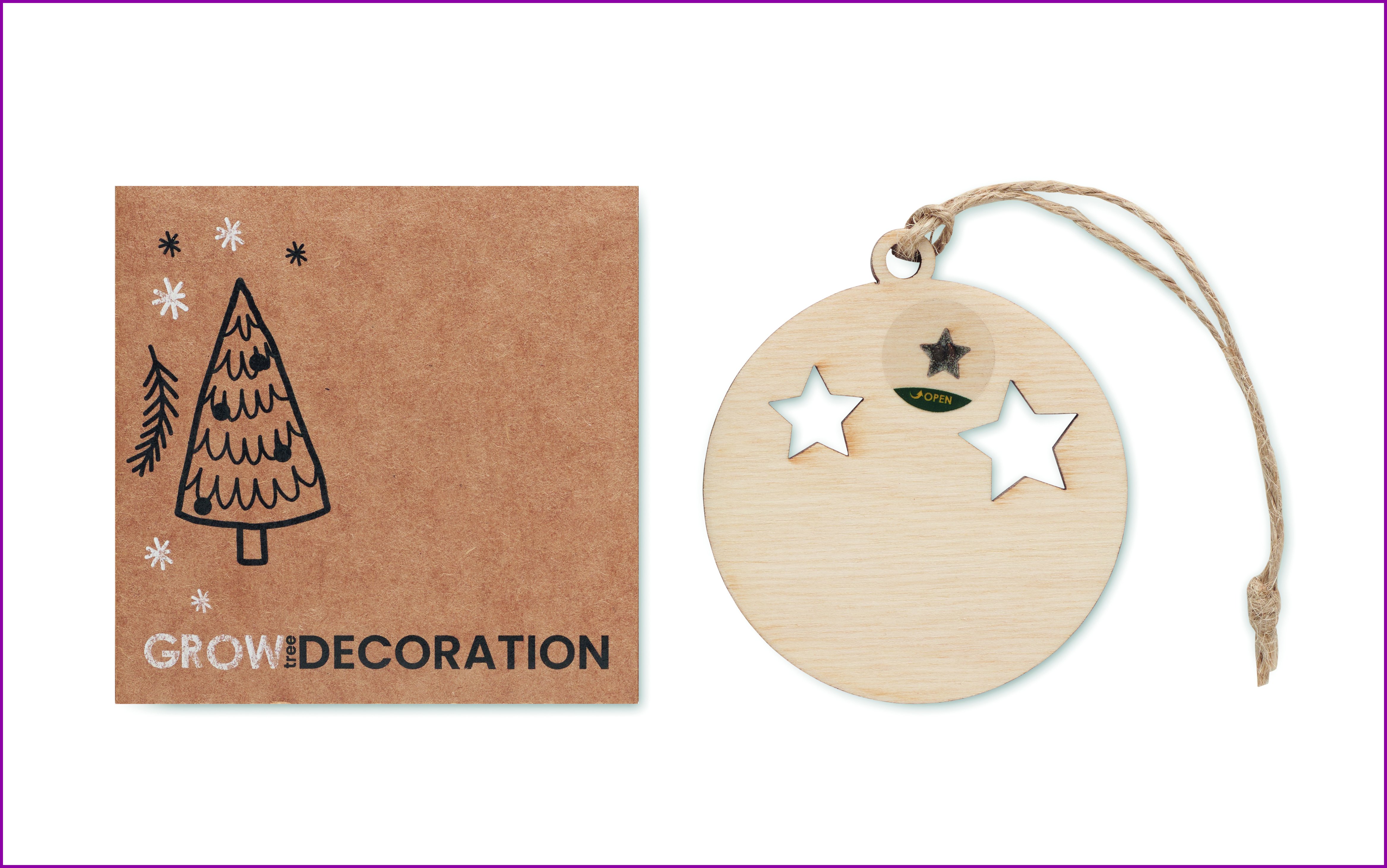 Puinen pallon muotoinen koriste, jossa on juuttinarua ja kuusen siemeniä. Toimitetaan ruskeassa paperikuoressa.