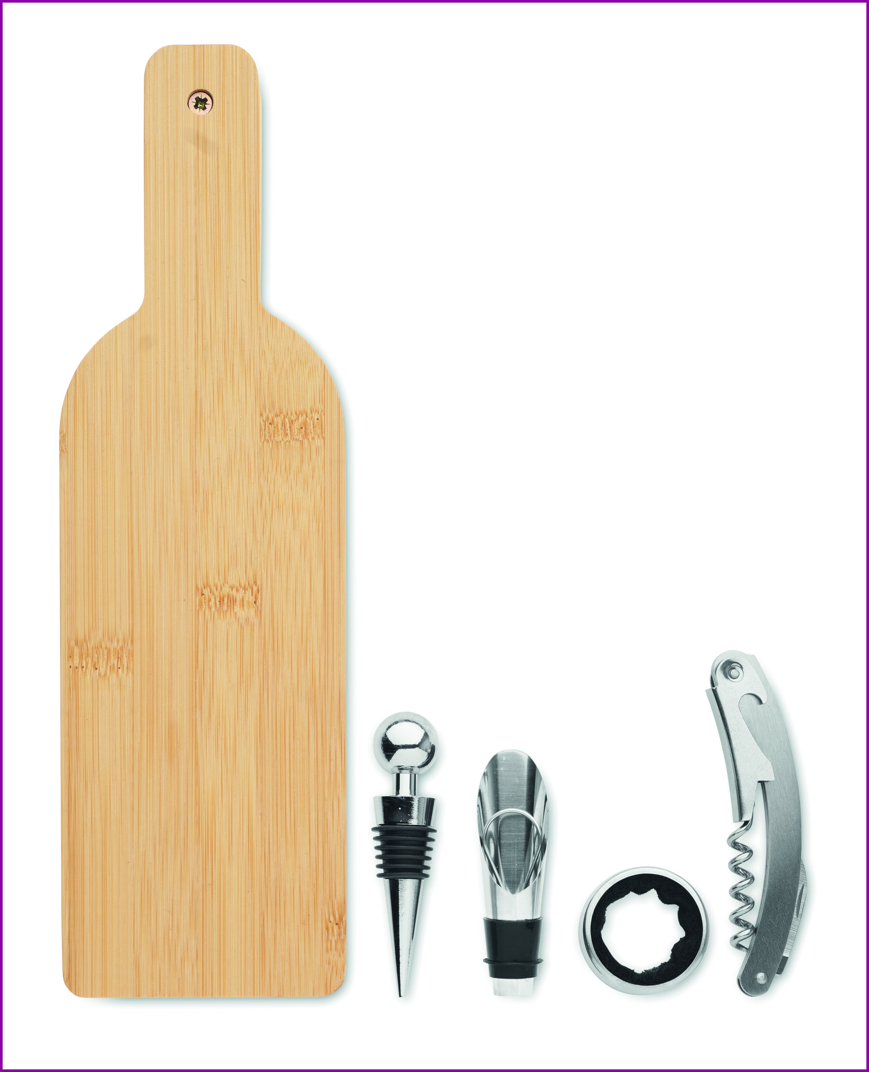 Pullon muotoinen viinisetti bambukotelossa. Sisältää korkkiruuvin, kaatonokan, pullonkorkin ja viinipullon tipparenkaan.