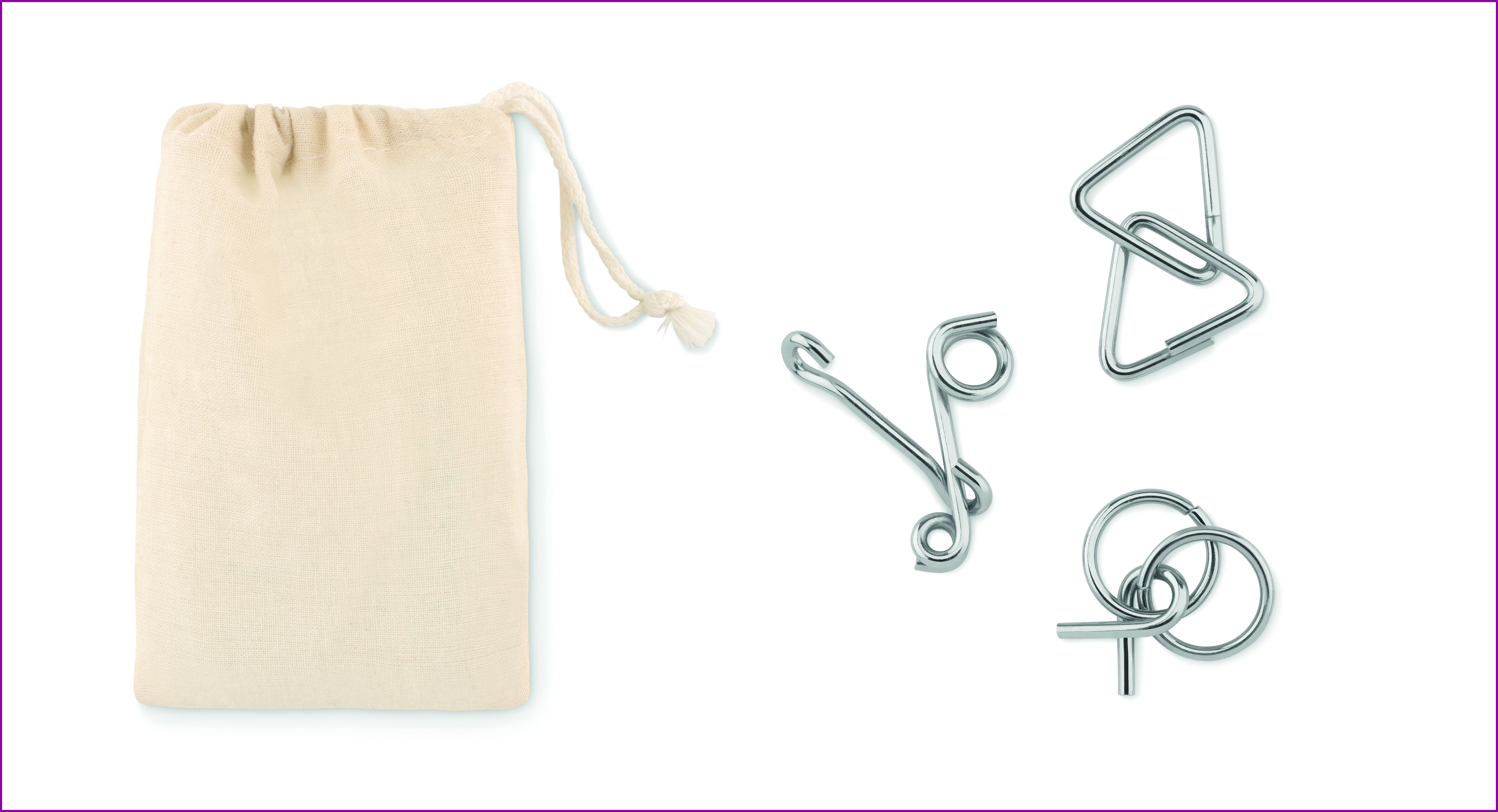 Sarja 3 erillaisia metallisia pulmapelejä, pakattuna puuvillapussiin.