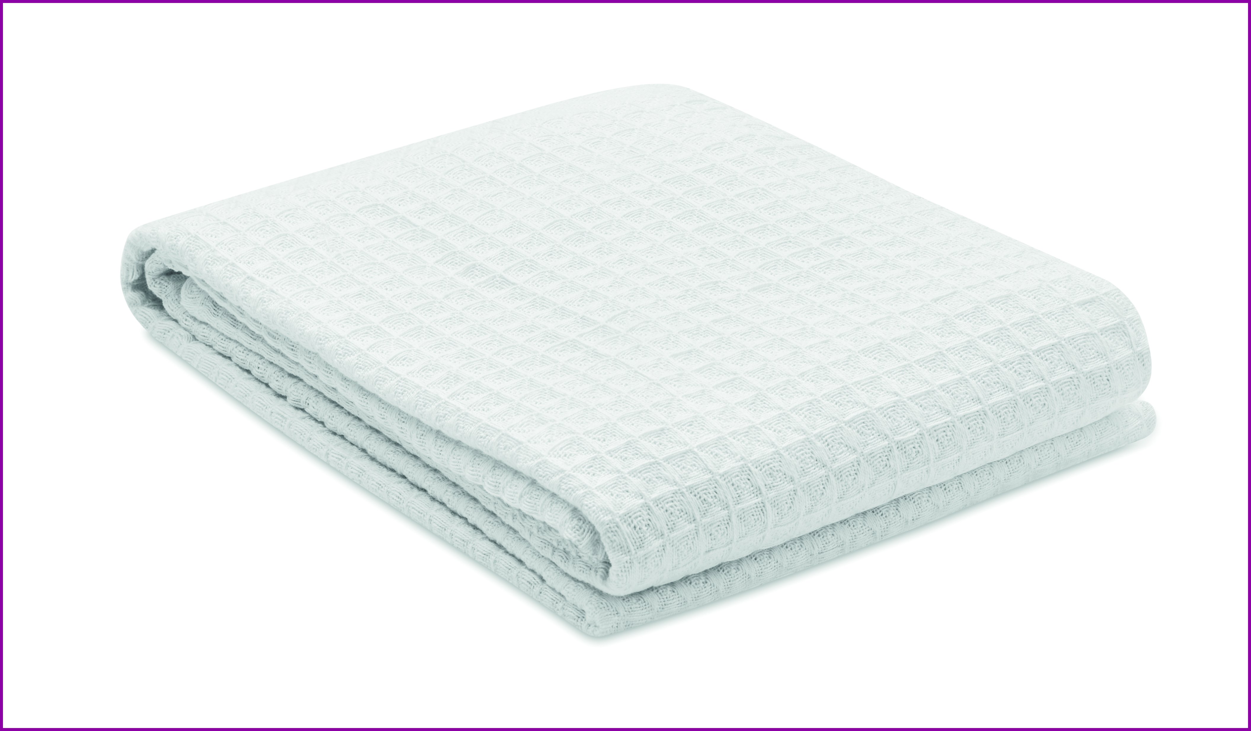 350 gr/m² kevyt puuvillainen vohvelipeitto. Valkoisessa kannellisessa laatikossa.