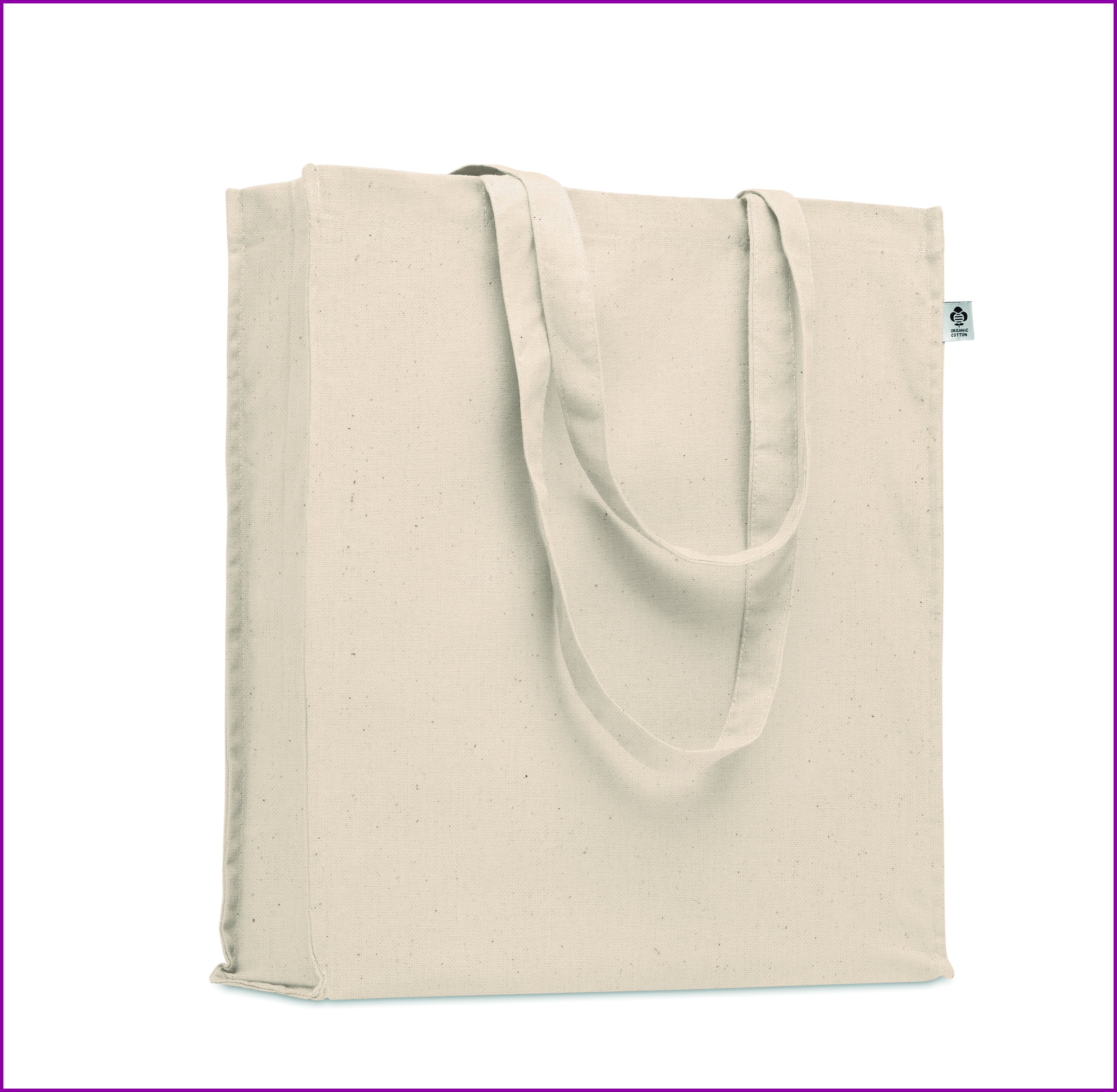 Luomupuuvillasta valmistettu ostoskassi, jossa on pitkät kahvat ja sivutaitteet. 220 gr/m².