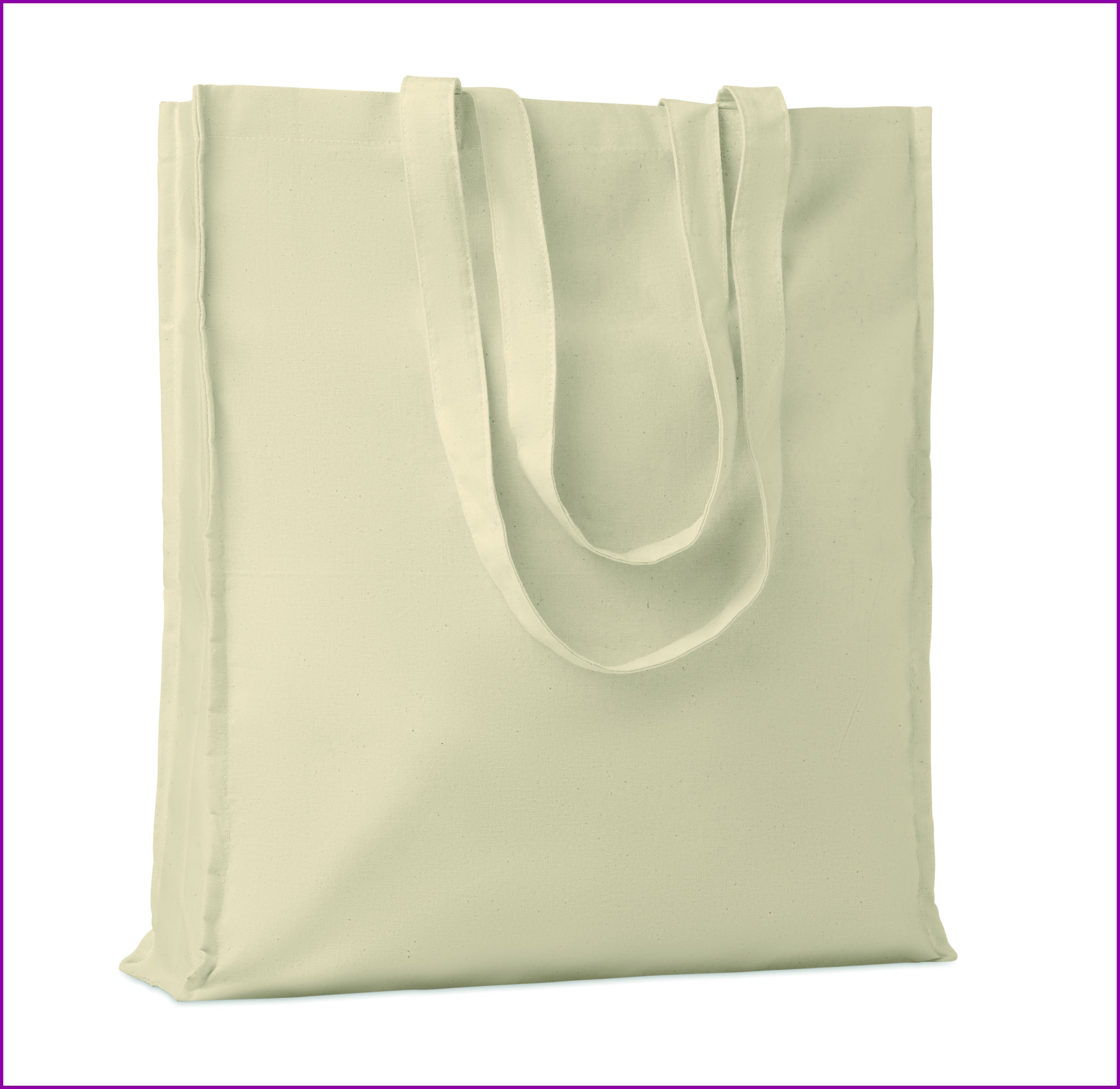 140 g / m² puuvilla kassi, pitkillä kahvoilla ja pohja levikkeellä.
