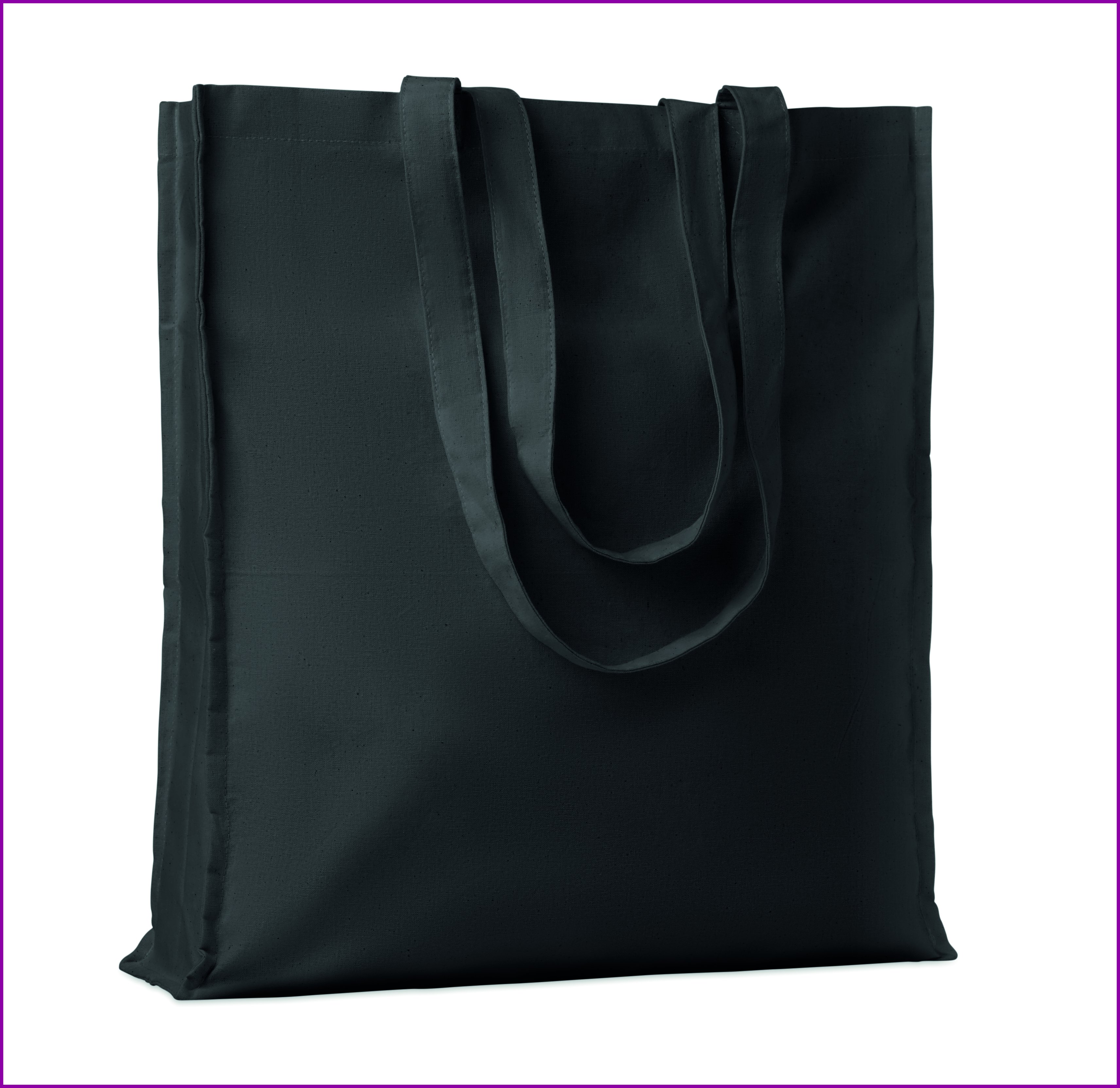 140 g/m² puuvilla kassi, pitkillä kahvoilla ja pohja levikkeellä.
