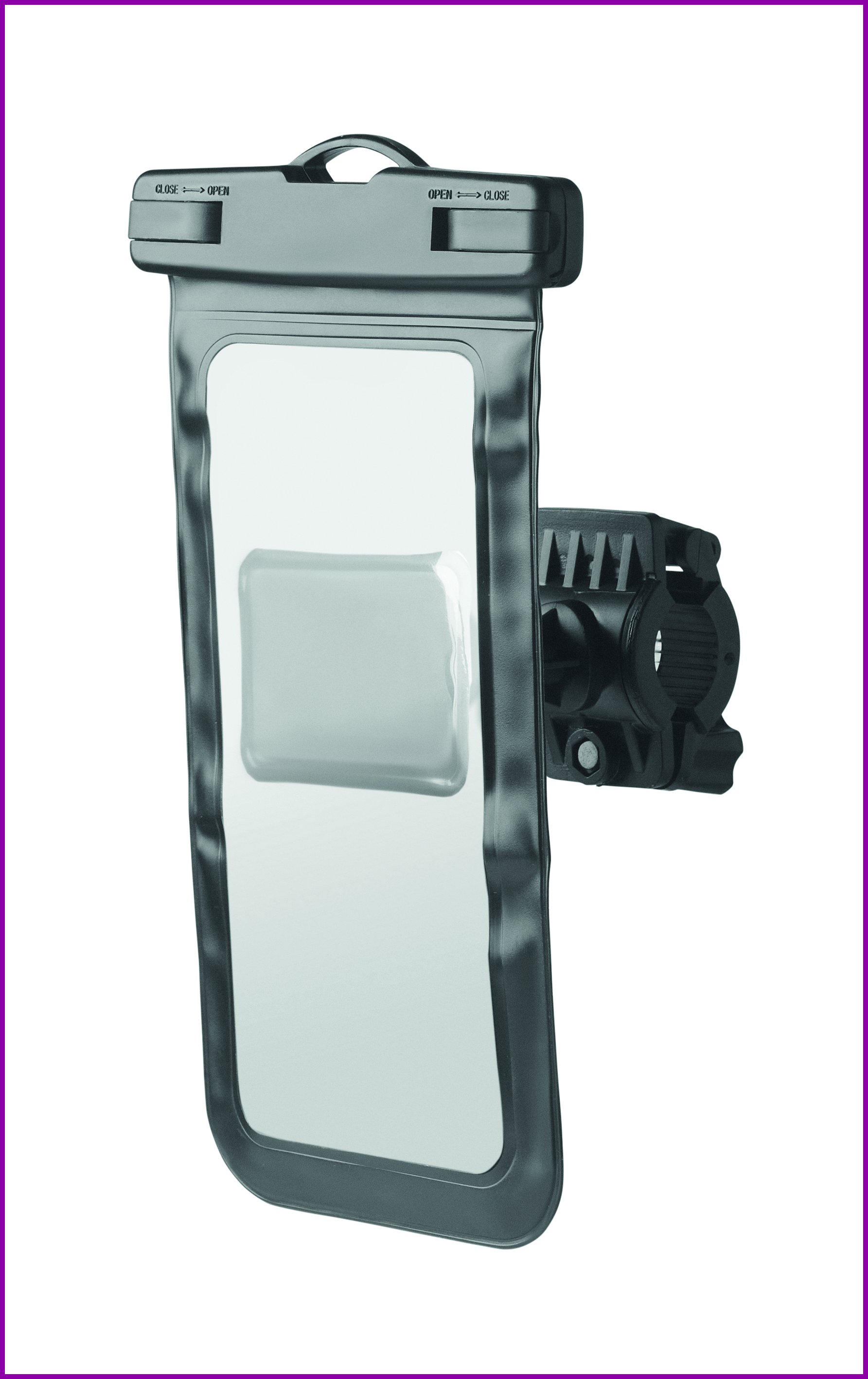 Vedenpitävä polkupyörään kiinnitettävä kotelo matkapuhelimelle. Materiaali PVC, 360 astetta käännettävissä. Vedenpitävyysluokitus: IPX 6. Sopii 6,7 tuuman kokoiselle puhelimelle.