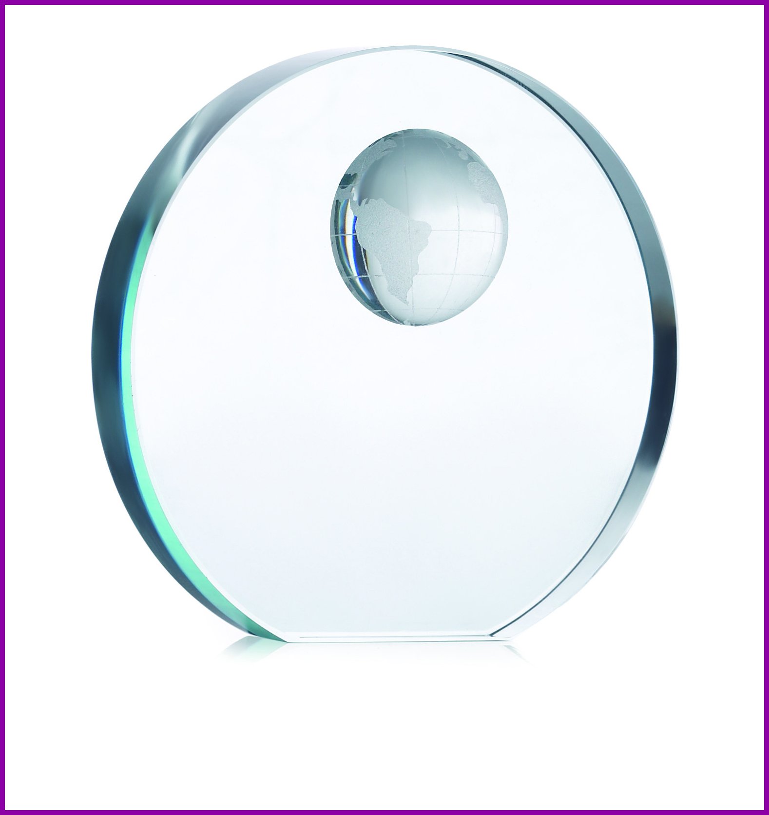 Pyöreä pokaali lasista, yläosassa kohokuviolla oleva maapallon puolikas. Sisältää lahjapakkauksen.