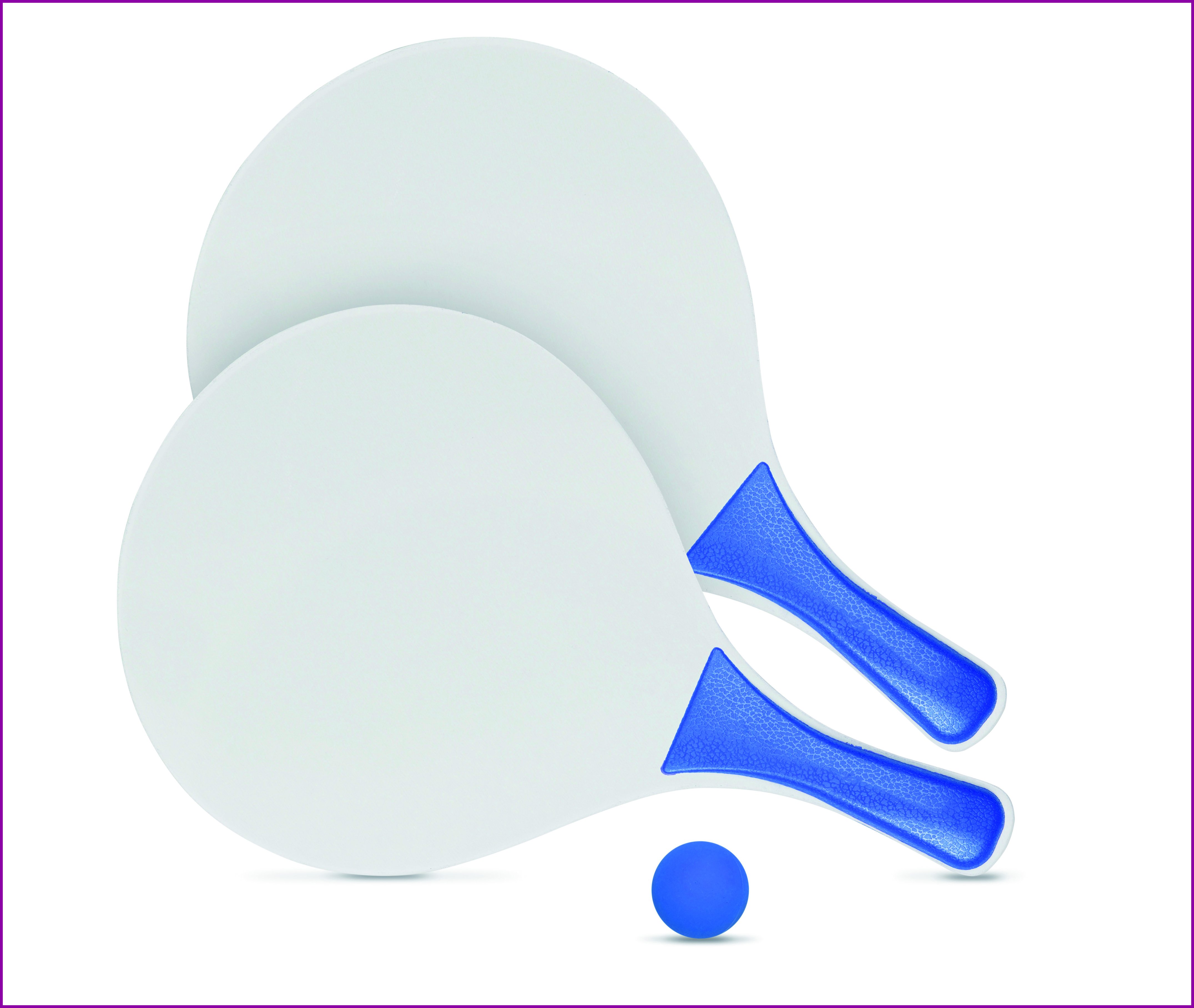 Rantatennissetti, kahdella MDF mailalla ja yhdellä pehmeällä pallolla.