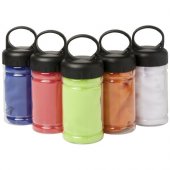 Hyvin imevä ja nopeasti kuivuva ja pestävä jäähdytyspyyhe, joka pitää viileänä treenin tai ulkoilun aikana. Valmistettu vahvasta ja kestävästä polyesteristä. Toimitetaan PET-kotelossa, jossa on kahva ja kiinteä haka kantamisen helpottamiseksi. Saatavilla 5 raikasta väriä. Suuri painatusala, painatus myös mahdollista itse pyyhkeeseen. Koko: 30 x 80 cm.Värit ja Koot