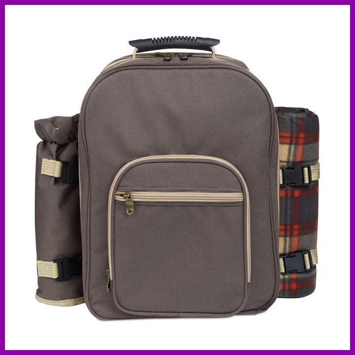 600D polyesterinen picnic reppu neljälle hengelle, sisältää viltin, pullon pidikkeen ja laadukkaat astiat.