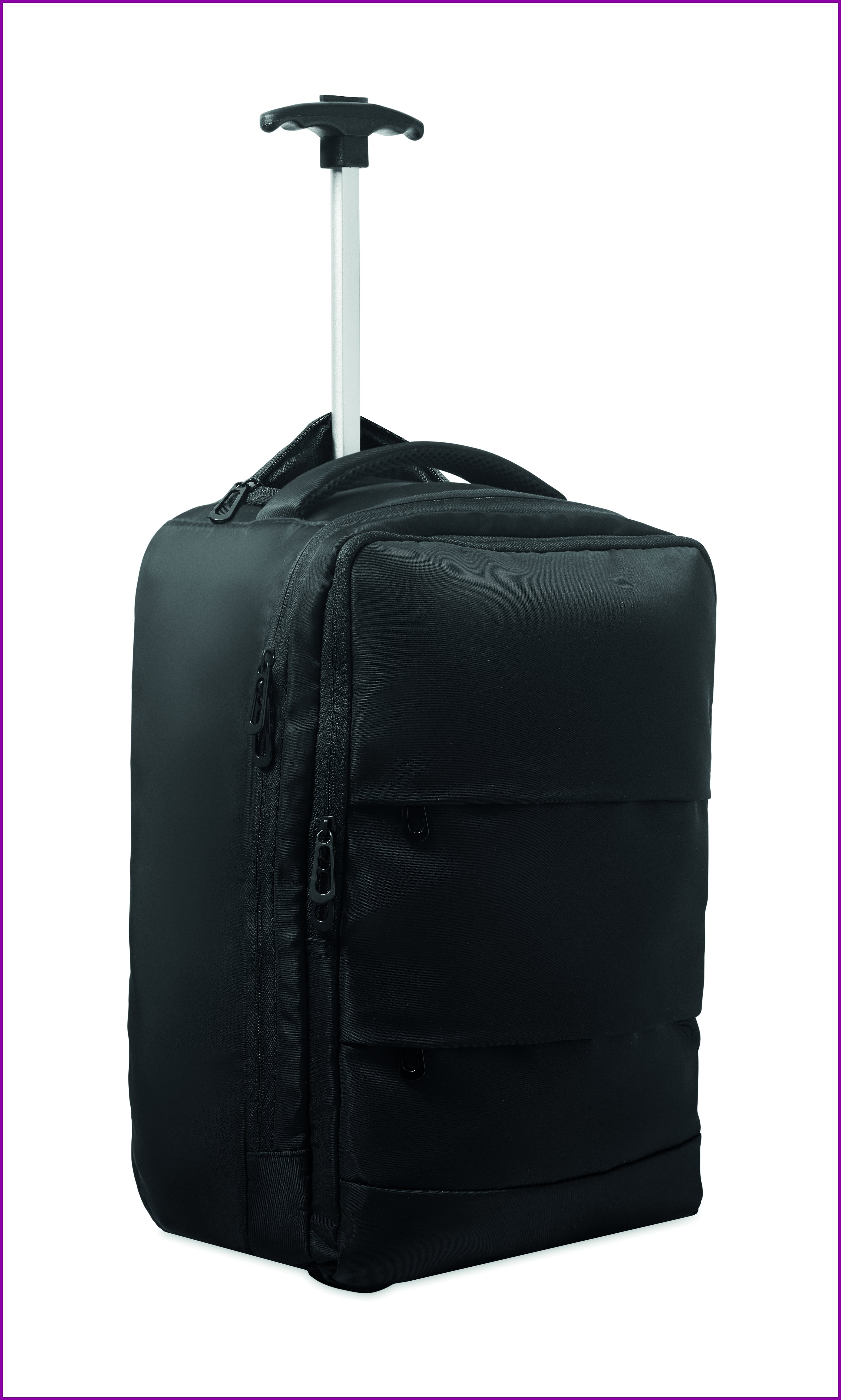 Reppu/trolley 290T RPET. 3 vetoketjullista etutaskua, pehmustettu 15 tuuman kannettavan tietokoneen lokero ja vetoketjullinen kylmäosasto. Pehmustettu selkäosa, olkahihnat ja takana lokero hihnoille.