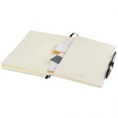 Joustava pehmeäkantinen muistikirja (A5-koko) elastisella suljennalla, nauhamerkillä, kynäsilmukalla. Asiakirjatasku takaosan sisäpuolella ja 80 arkkia (80gsm) kermanväristä viivallista paperia. Pakattu mustaan kuoreen.Värit ja Koot