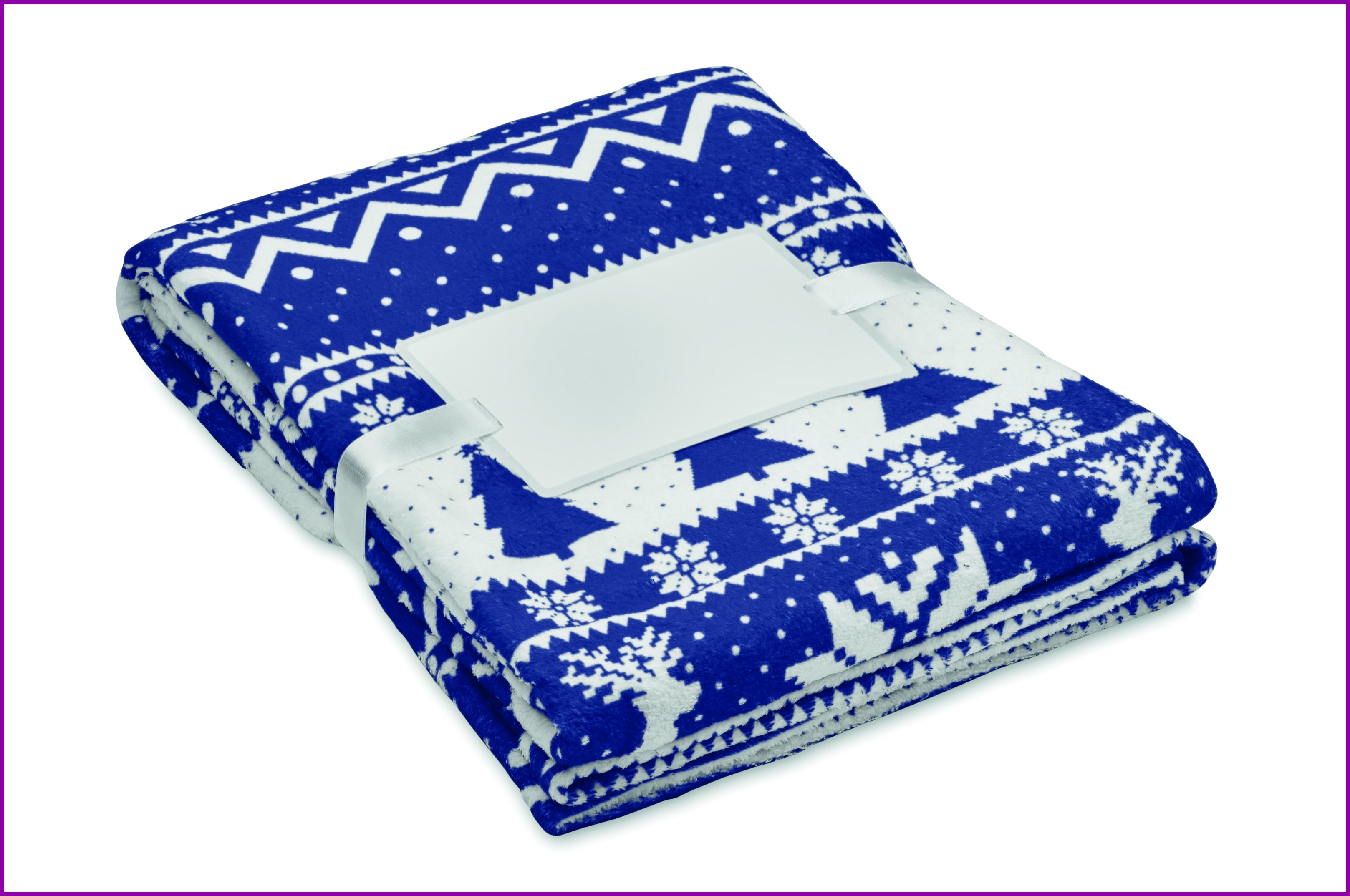 190 gr/m² RPET-korallifleecehuopa, jossa on talvikuvio. Kääritty nauhaan ja tulostettavaan korttiin.