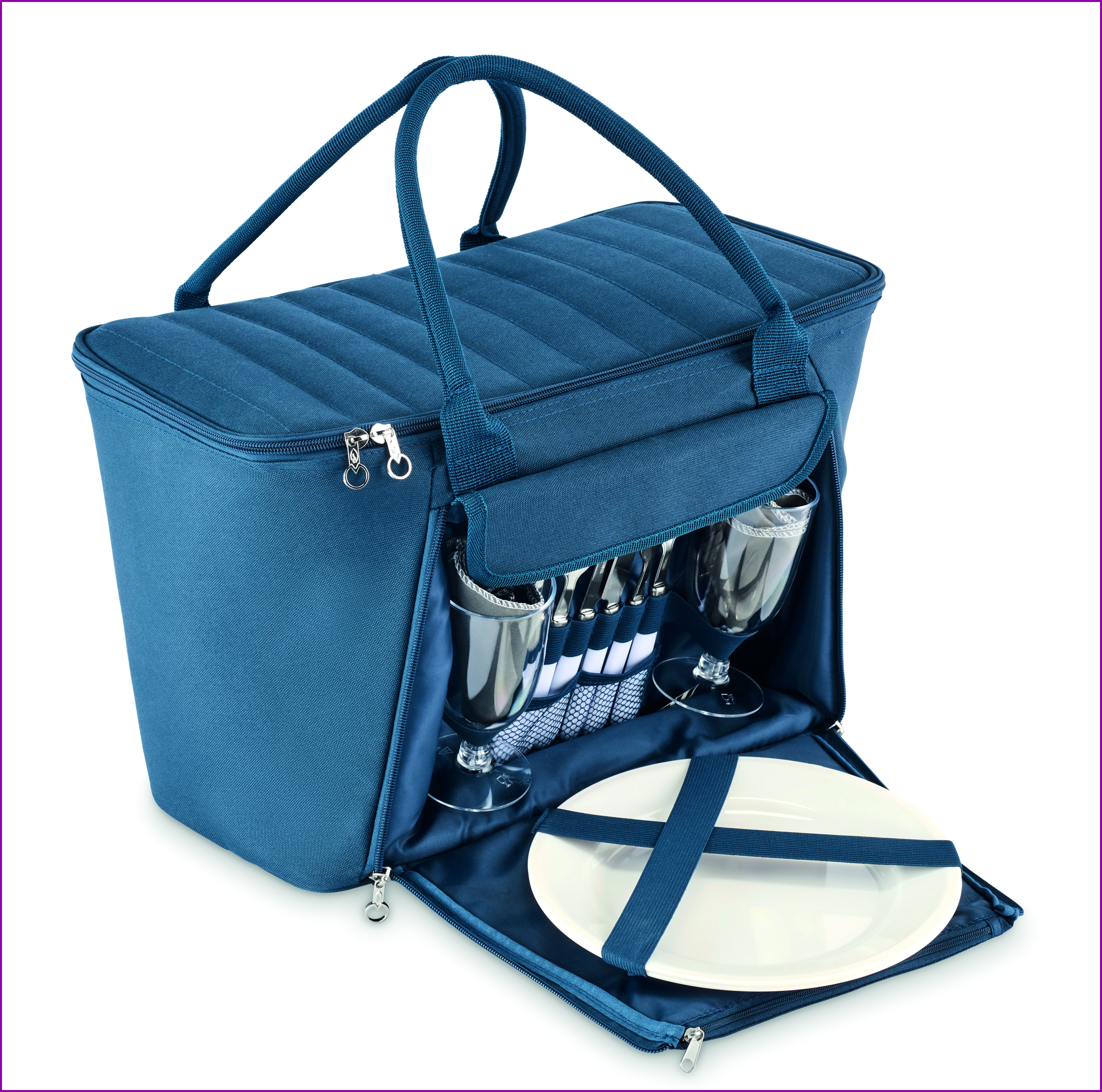 Picnic-kylmälaukku 600D RPET-polyesteristä kahdelle hengelle. Vetoketjullinen etutasku, mukana ruostumattomat aterimet, 2 PS-lautasta, 2 PS-lasia ja 2 puuvillaliinaa. Tilavuus 18?L.