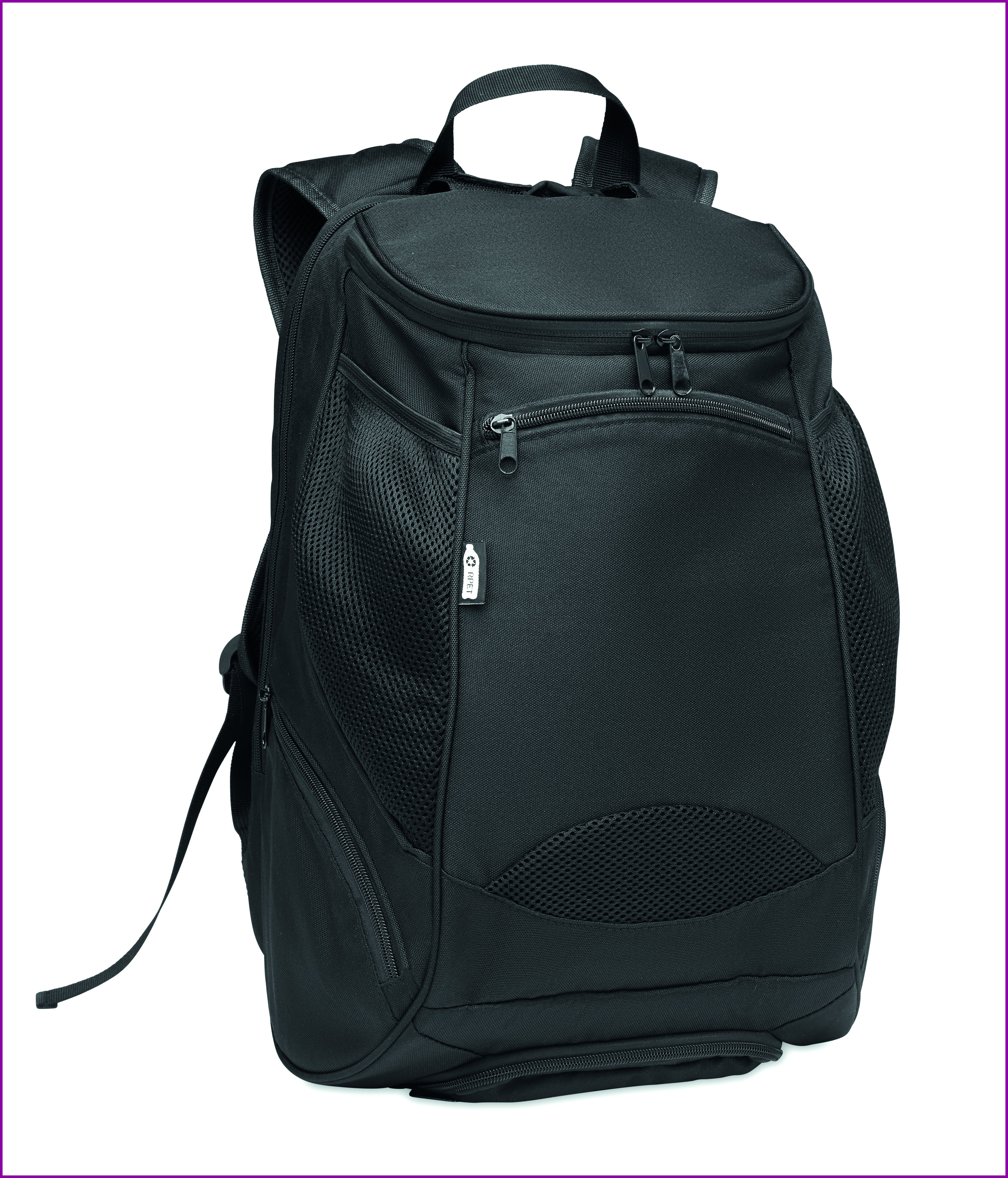 Käytännöllinen RPET 600D reppu, usealla osastolla ja säädettävillä olkaimilla.