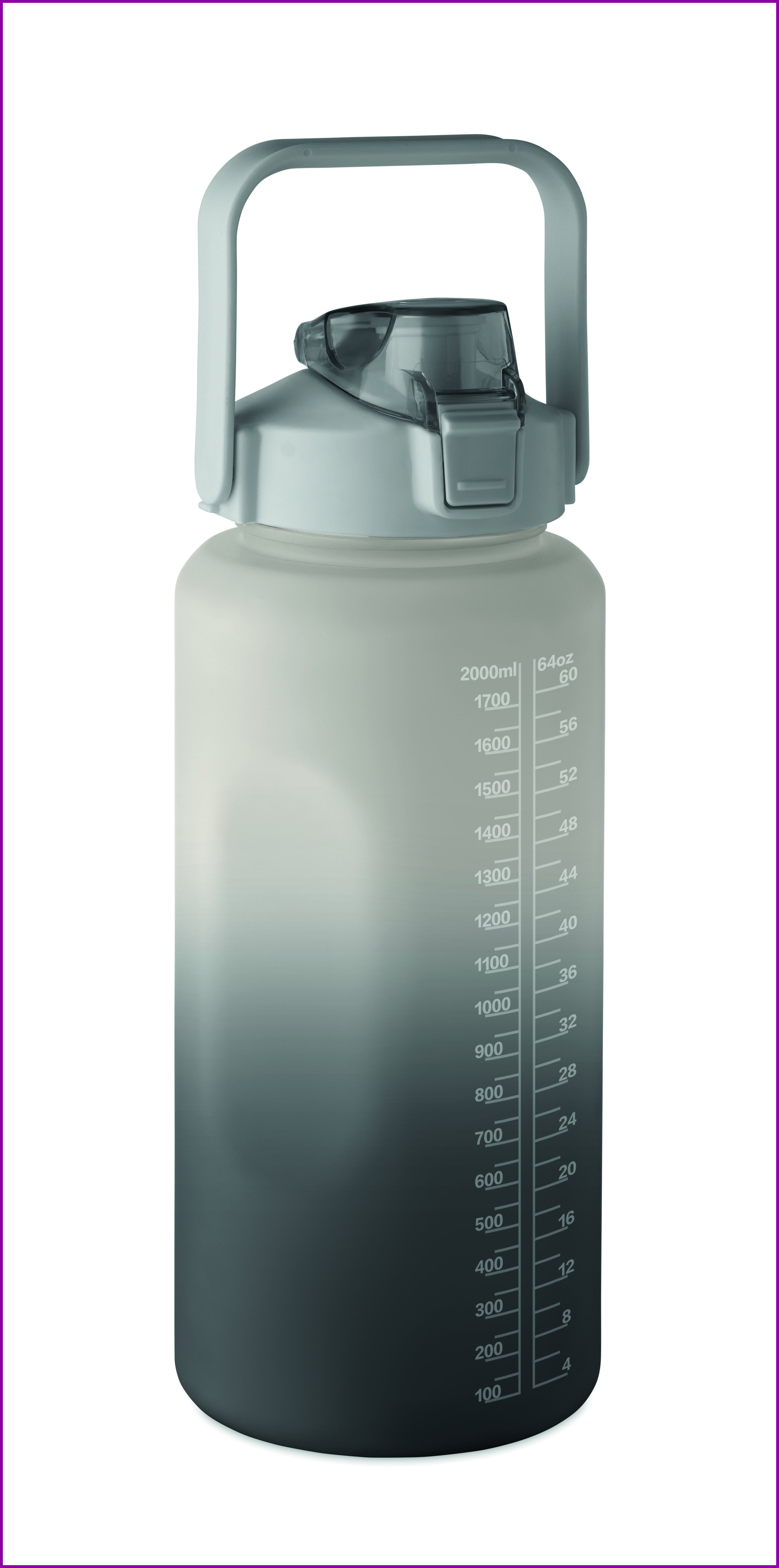 Motivoiva vesipullo RPET-muovista. Yhdellä kädellä avattava läppäkorkki pillillä, turvalukolla ja kahvalla. Vuotamaton. Tilavuus: 2000 ml