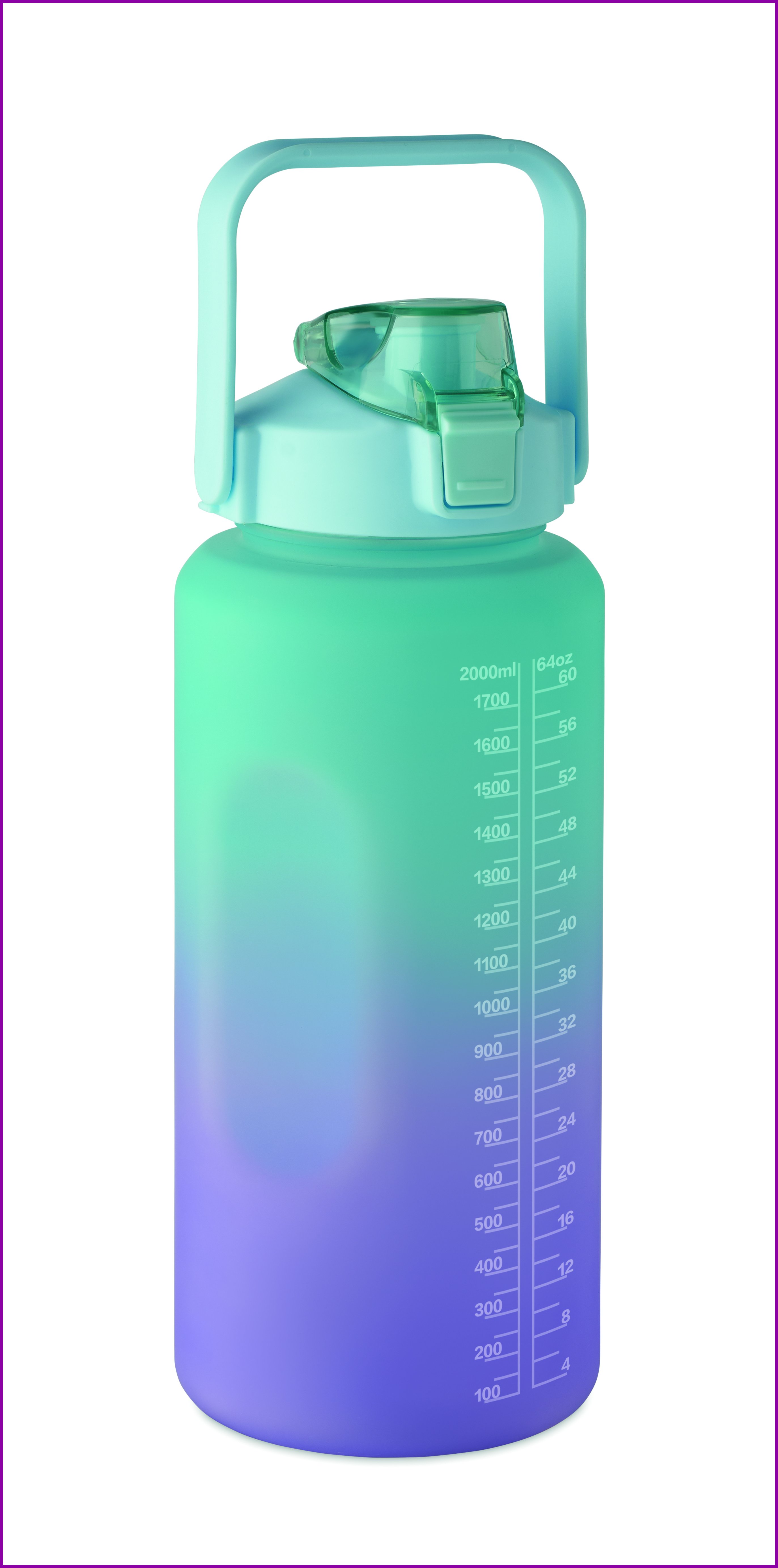 Motivoiva vesipullo RPET-muovista. Yhdellä kädellä avattava läppäkorkki pillillä, turvalukolla ja kahvalla. Vuotamaton. Tilavuus: 2000 ml
